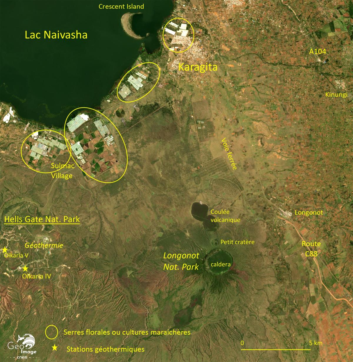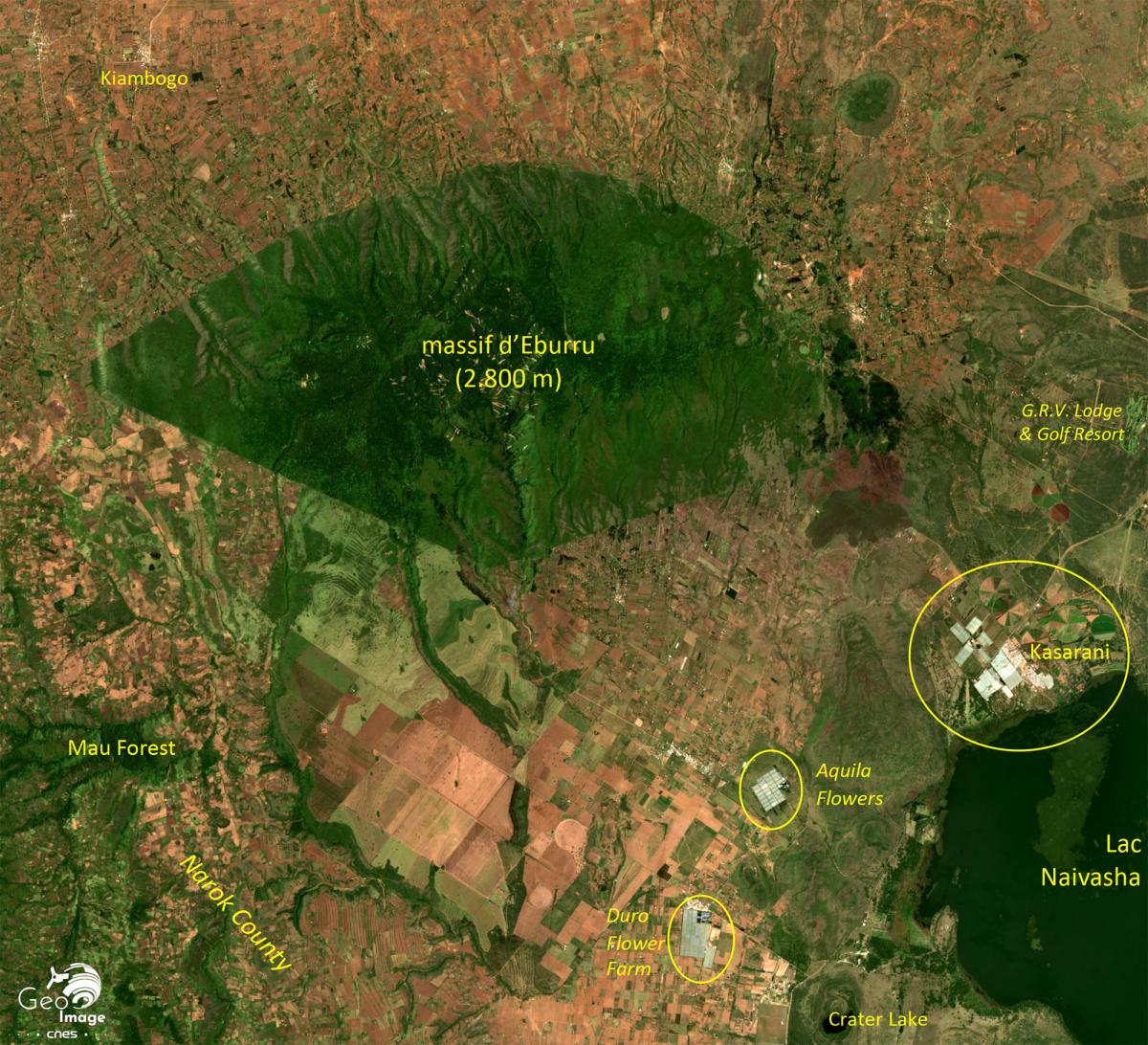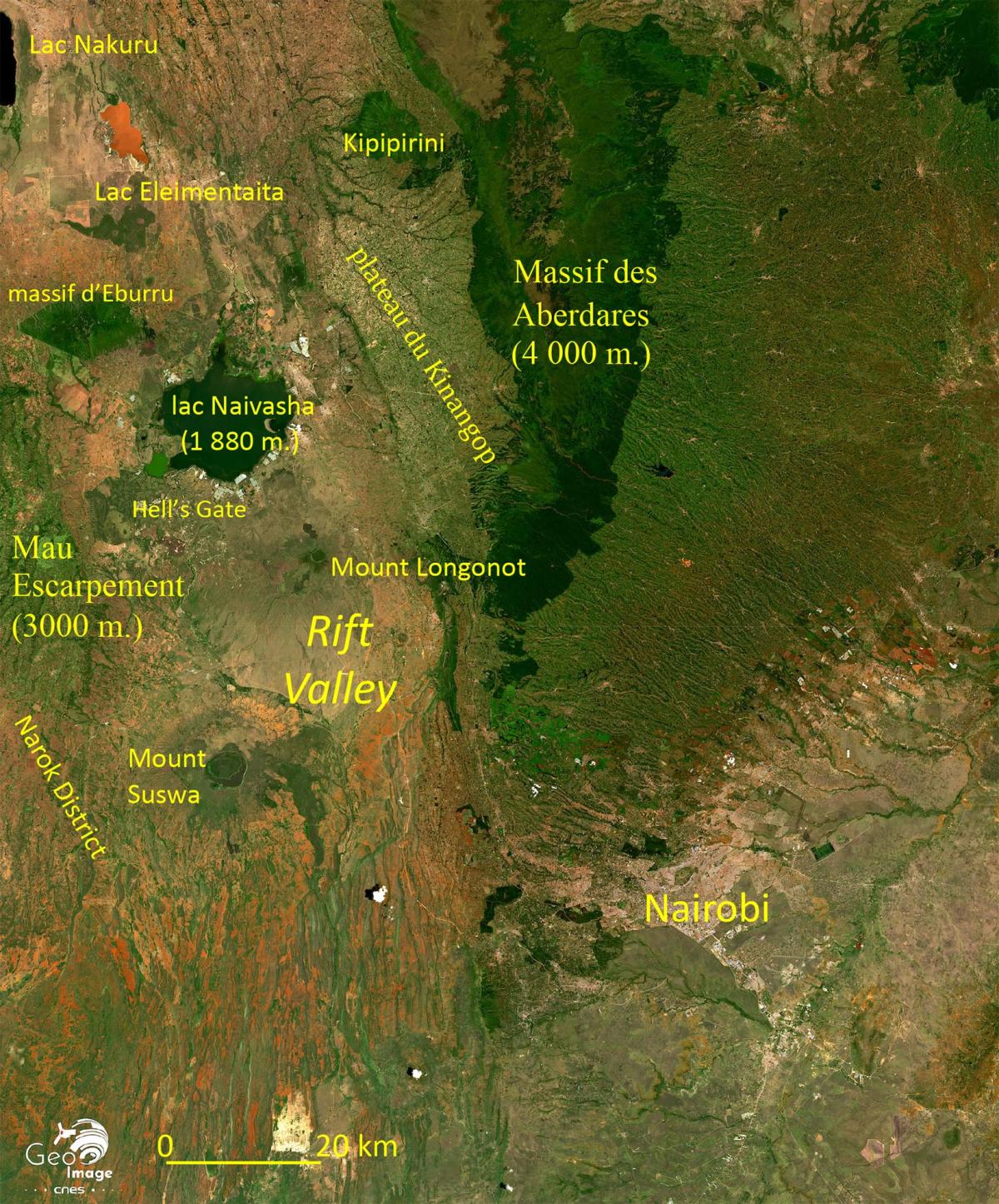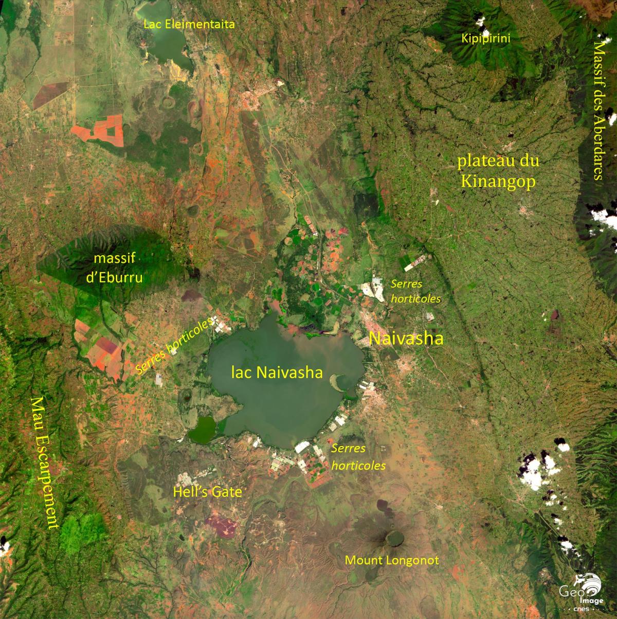 Centrée sur le lac Naivasha qui fait 139 km2, l’image présente une section de la Rift Valley kenyane - également appelé Rift Gregory, orientée Nord-Sud. Le fond de la vallée à 1.880 m. d’altitude au lac Naivasha et à 1.790 m. au lac Eleimentaita est ici prise entre, à l’est le sud du massif des Aberdares, qui culmine à 4.000 m., et, à l’ouest le Mau Escarpement, qui culmine à 3.000 m..