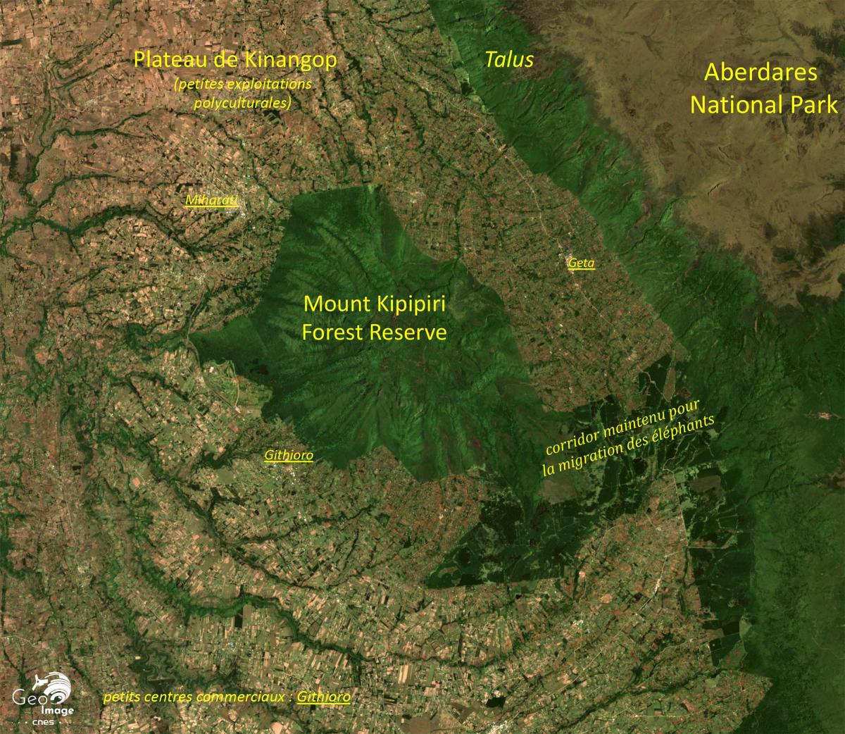 Un véritable marché de la faune sauvage s’est mis en place, au grand bénéfice des propriétaires privés, qui explique en partie la résilience de la propriété foncière post-coloniale. Le défi majeur concerne les éléphants qu’il est coûteux de transporter mais dont la survie dépend de migrations sur de grandes distances, le long de corridors. Ici, ils ne migrent plus qu’entre les Aberdares et le massif de Kipirini (est de l’image) grâce au corridor maintenu et même reconstitué entre les deux.