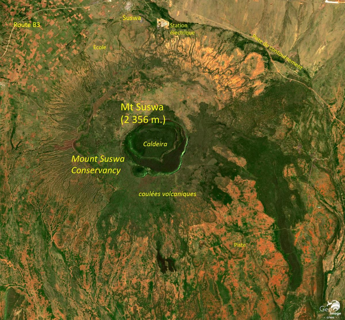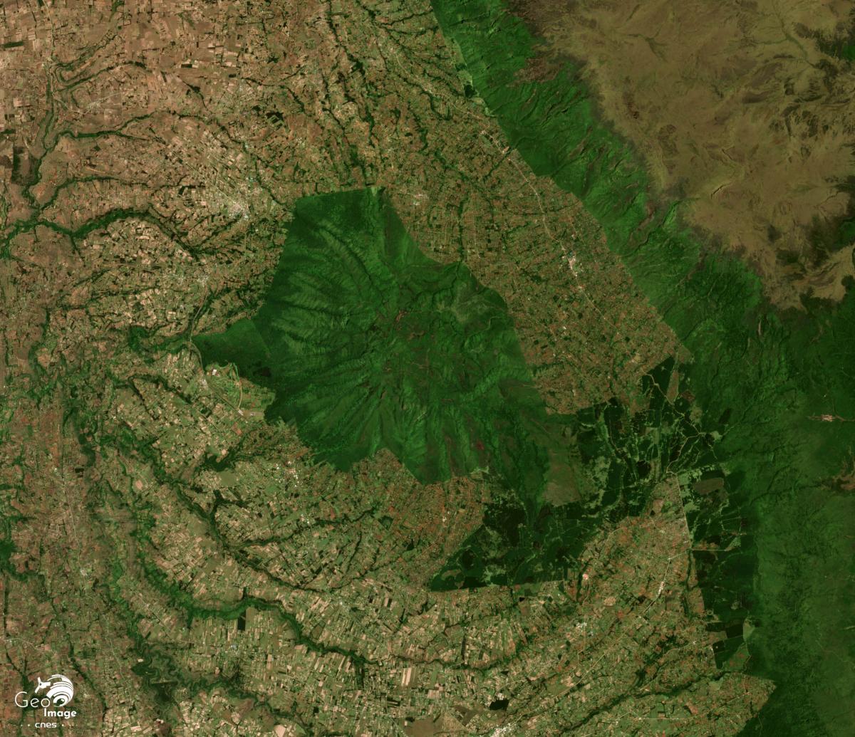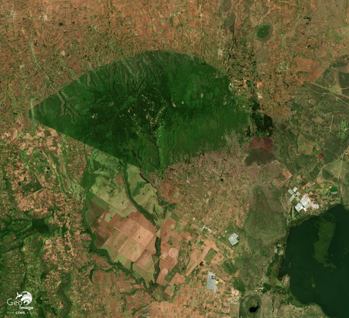Le point le plus bas de la région ici présentée est situé à l’extrême nord-ouest de la scène dans les deltas des rivières qui se jettent dans le lac Nakuru (juste hors image) à 1.770 m. Il s’agit donc de la partie sommitale du dôme kenyan. Plus au nord (hors image), le lac Turkana et plus au sud le lac Magadi ne sont en effet respectivement qu’à 500 et 600 m d’altitude.