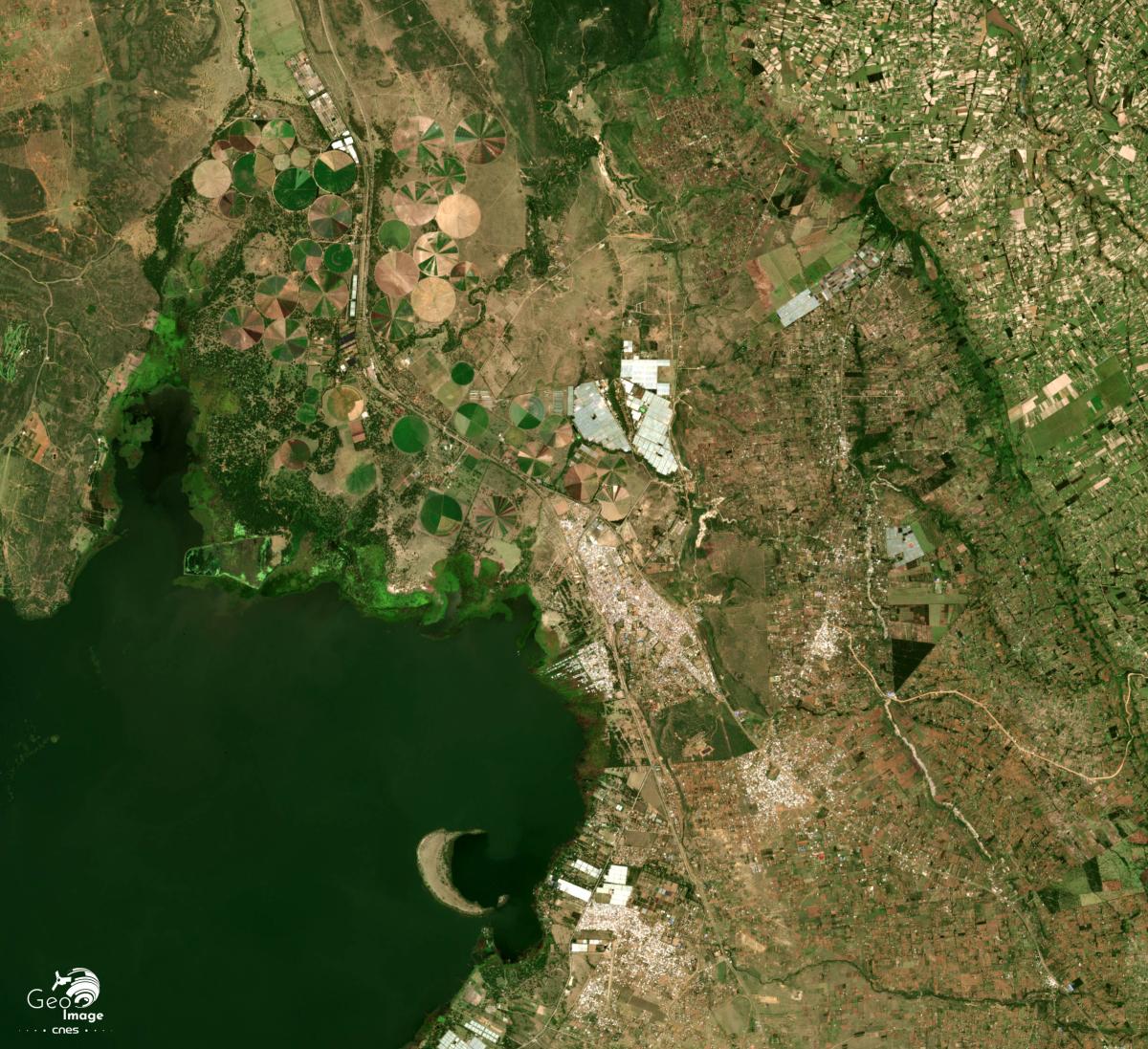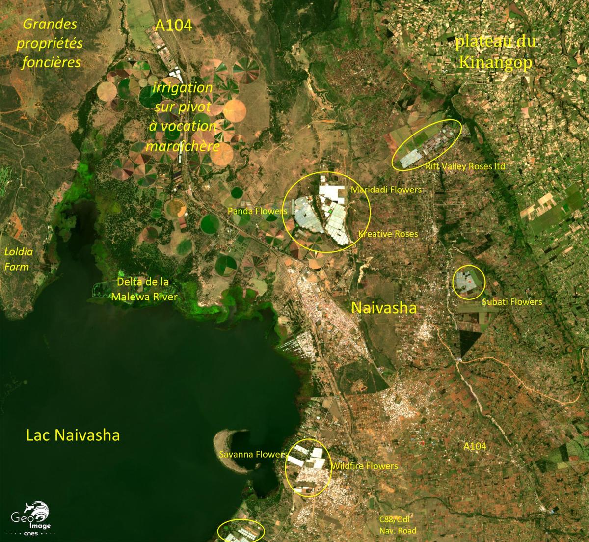 Beaucoup de ces domaines se sont reconvertis. Assez tôt, certains propriétaires ont mis en place des stratégies d’intensification au moyen d’une irrigation sur pivot à vocation maraîchère très lisible sur l’image juste en amont du delta de papyrus de la Malewa. D’autres, surtout près des rives du lac Naivasha - qui est un lac d’eau douce au contraire d’Eleimentaita - ont loué une partie de leurs terres à des horticulteurs qui y ont construit d’immenses serres à orientation rosicole.