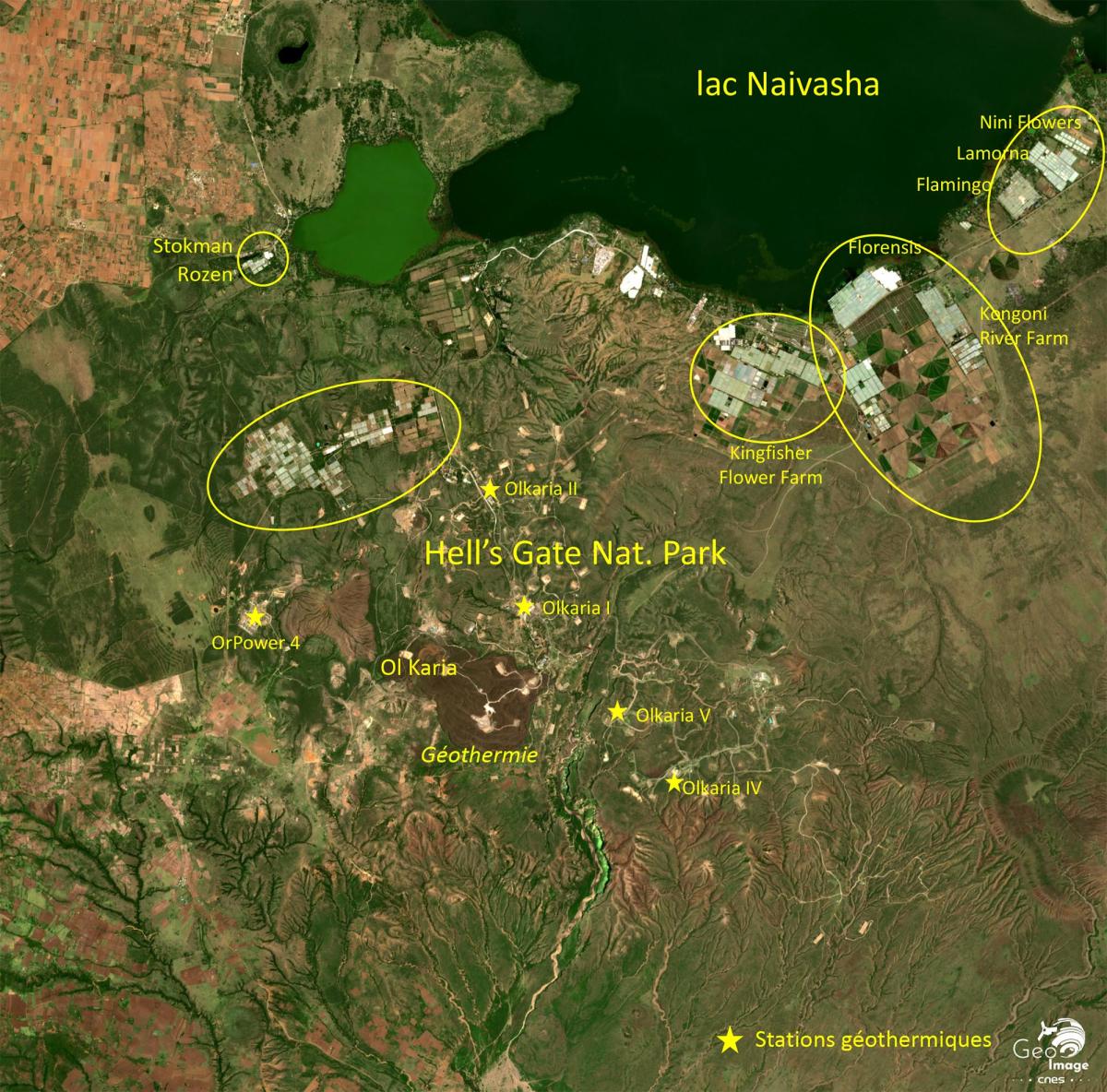 Au sud-ouest du Lac Naivasha, un semis de carrés blancs piquète le vert sombre du Hell’s Gate National Park indiquant une ouverture de la brousse du parc. Ce semis de clairières correspond à autant de forages géothermiques des projets Olkaria. Ces forages d’environ 3 000 m. de profondeur nécessitant 60 jours de forage captent une vapeur d’eau à plus de 250°, transportée ensuite dans des conduites vers une centrale électrique.