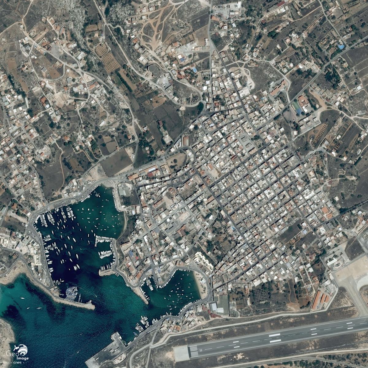 Image satellite de Lampedusa, petite île située au centre de la mer Méditerranée, d’une superficie d’environ 20 km², Cette image a été prise le 11 août 2020 par un satellite Pleiades. Il s'agit d'une image satellite, vraie couleur, de résolution native à 0,70m, ré-échantillonnée à 0,5m.