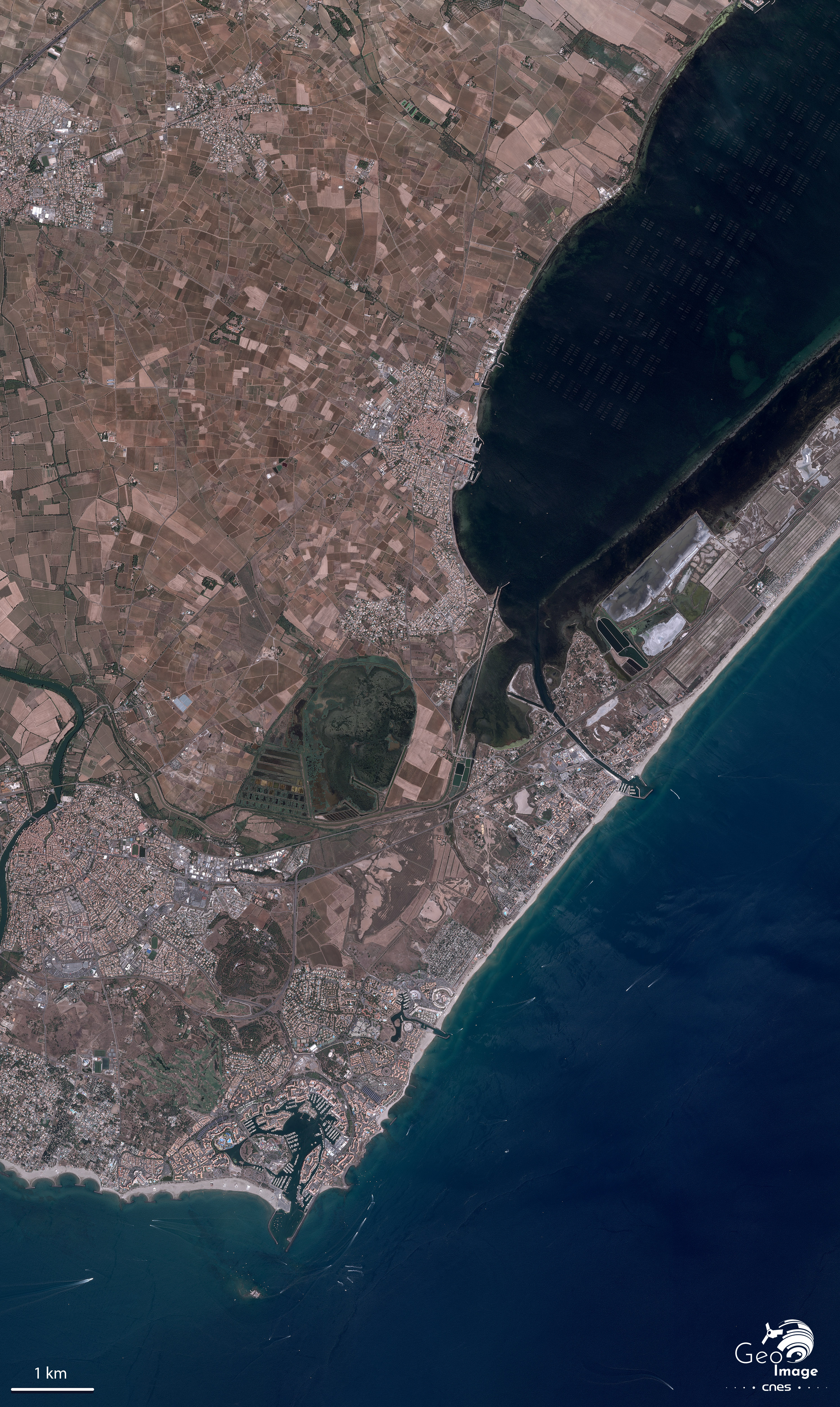 Situé au cœur d’une région très urbanisée comprise entre deux pôles majeurs, Montpellier à l’est à environ 40 km et Béziers à l’ouest à environ 20 km, le territoire visible sur l’image montre un paysage caractéristique du littoral languedocien et de son arrière-pays. On retrouve ainsi un long linéaire côtier sableux et ses espaces lagunaires marqués par la présence d’étangs - étang de Thau, étang du Bagnas - et de marais (marais du petit Bagnas). Le cordon littoral est percé de graus - qui ont été canalisés - tel celui du Rieu qui permet de relier le vaste étang de Thau, dont l’image fait apparaître à l’ouest sa partie occidentale, à la Méditerranée. Enfin, on doit constater la forte présence de la viticulture, qui semble résister face au front d’urbanisation et à la touristification même si la dynamique périurbaine est à l’œuvre.
