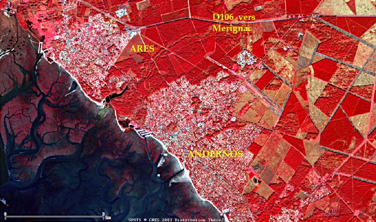 Le Bassin d’Arcachon, lagune semi fermée de 156 km², s’ouvre sur l’océan par deux étroites passes soumises à une forte courantologie de dominante nord-ouest. L’image Sentinel 2A du 09/05/2017 a été prise à marée descendante découvrant les bancs de vase. Les taches blanches périphériques sont autant de villes montrant l’attrait du Bassin pour une clientèle aisée, non seulement bordelaise mais aujourd’hui parisienne avec la ligne TGV. Cela se traduit par une très forte urbanisation littorale coalescente qui remet en cause les milieux naturels, en particulier les zones humides bordières du Bassin. Cette urbanisation se développe plus sur la rive nord du Bassin du fait de la proximité avec la grande périphérie sud-ouest bordelaise et l’installation de sites de recherches de nouvelles technologies.