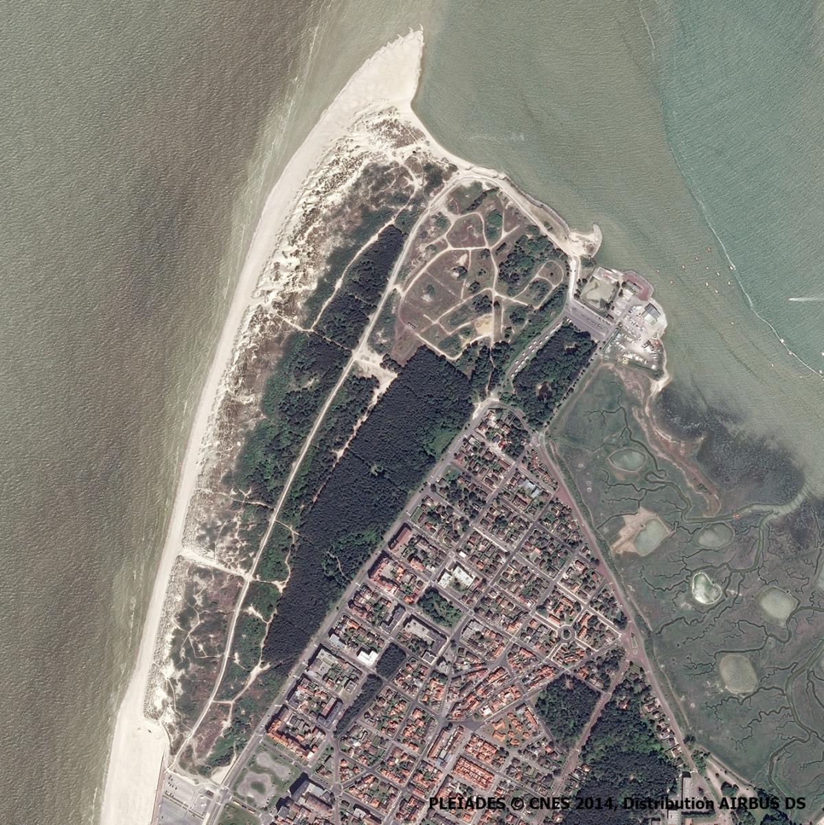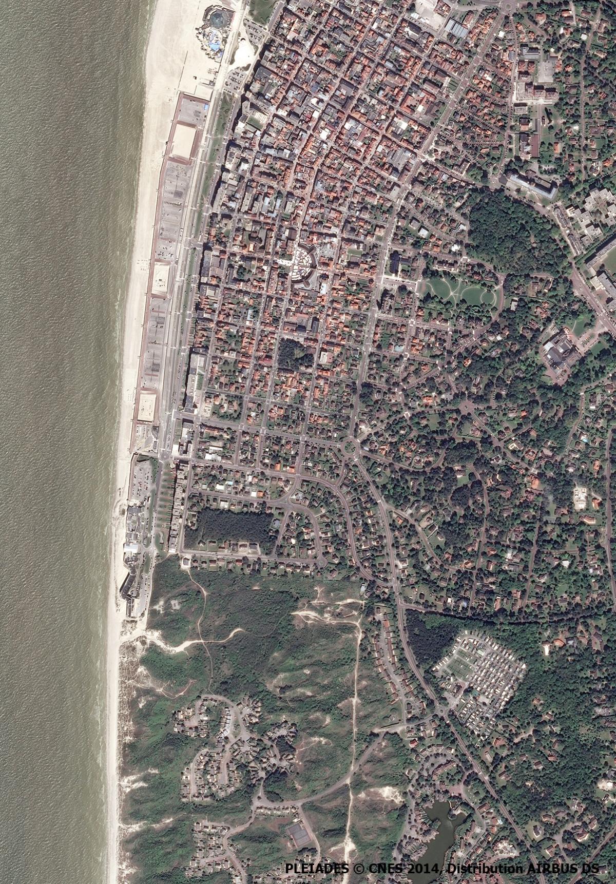 L’image satellitaire montre encore les marques paysagères de la forêt ou des dunes mais aussi celle de la « première station ». Elle est organisée autour d’un plan en damier parallèle à la mer où sont lotis les premiers immeubles et villas dès 1882. Les grands hôtels s’implantent en situation littorale durant la même décennie ainsi que le premier casino.
