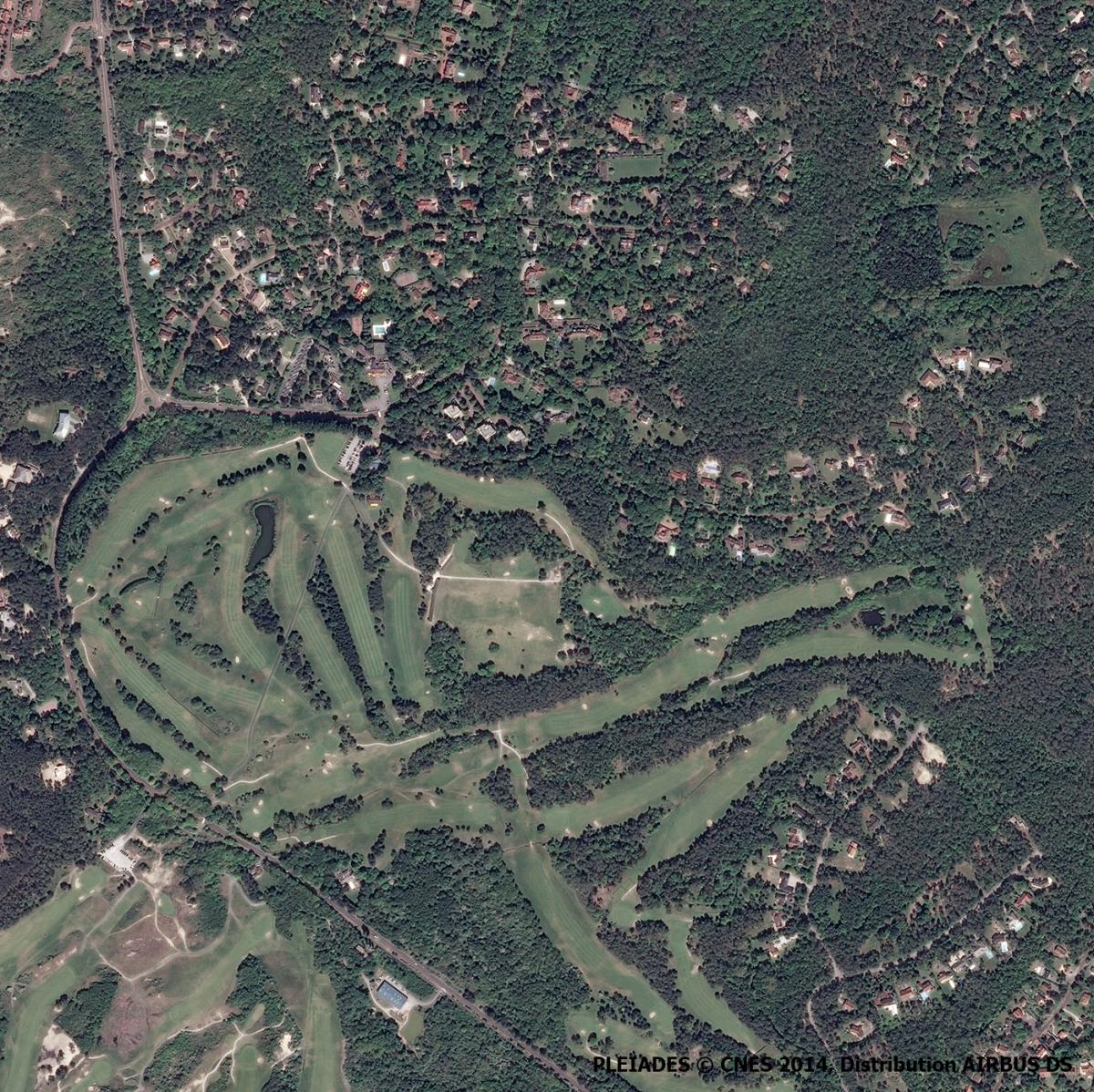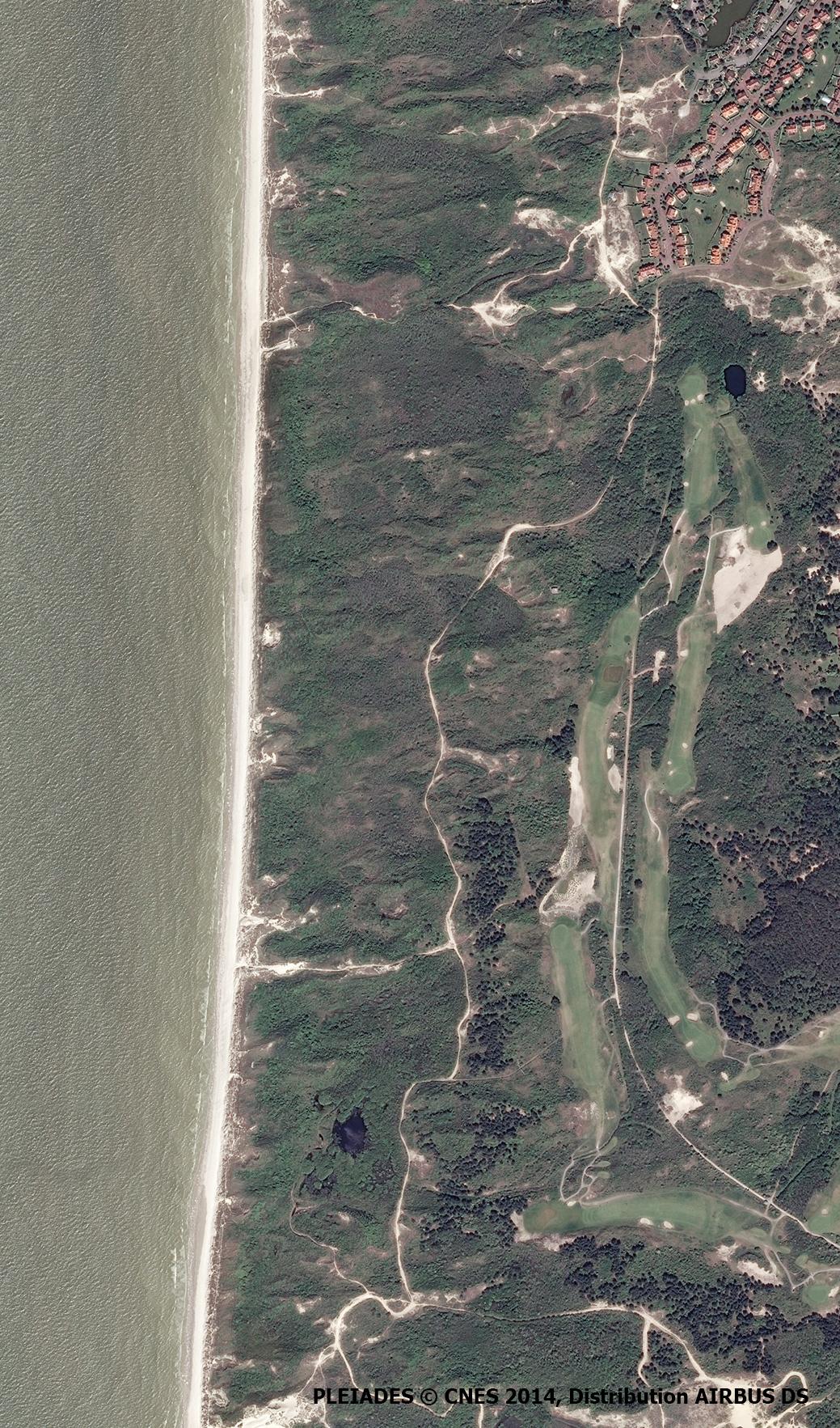 Le golf est visible au sud de l’image. Il est reconnaissable parce que ses parcours forment de longues trouées dans le couvert forestier. Le zoom sur l’entrée du golf, l’espace dunaire et la forêt parsemée de villas permet d’aborder à la fois la géohistoire de la station et les spatialités qui l’animent aujourd’hui.