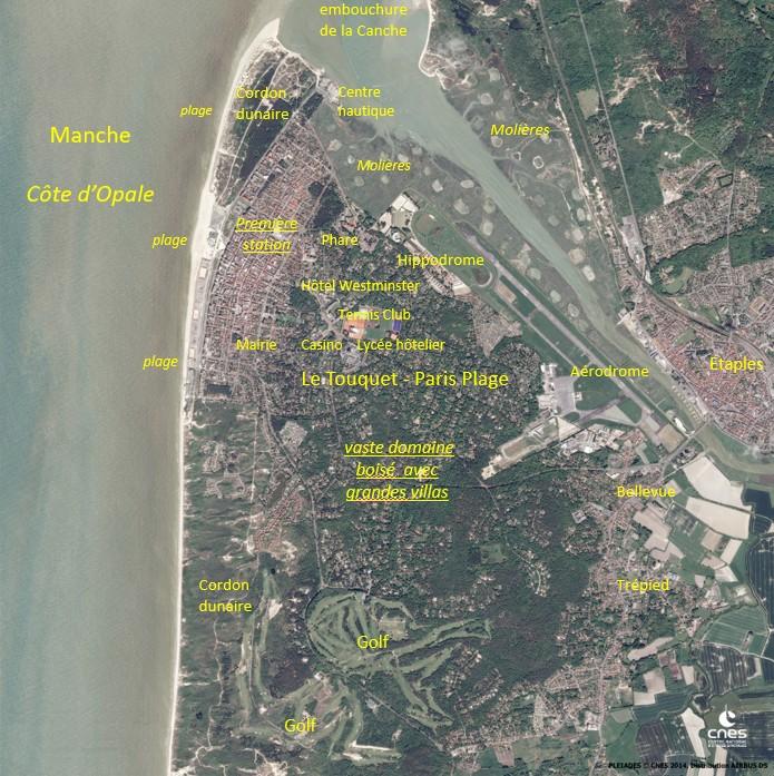 Le reste du territoire de la station du Touquet-Paris-Plage est divisé entre le littoral dunaire où se situe la première station héritière du XIXème siècle, un vaste domaine boisé en position d’abri et un espace agricole après les deux villages de Cucq et du Trépied qui achève l’image vers l’est. De l’autre côté de la Canche, la ville d’Etaples occupe tout le nord-est de l’image. Forte d’environ 11 000 habitants ; elle est ville « support » depuis l’origine pour le Touquet-Paris-Plage.
