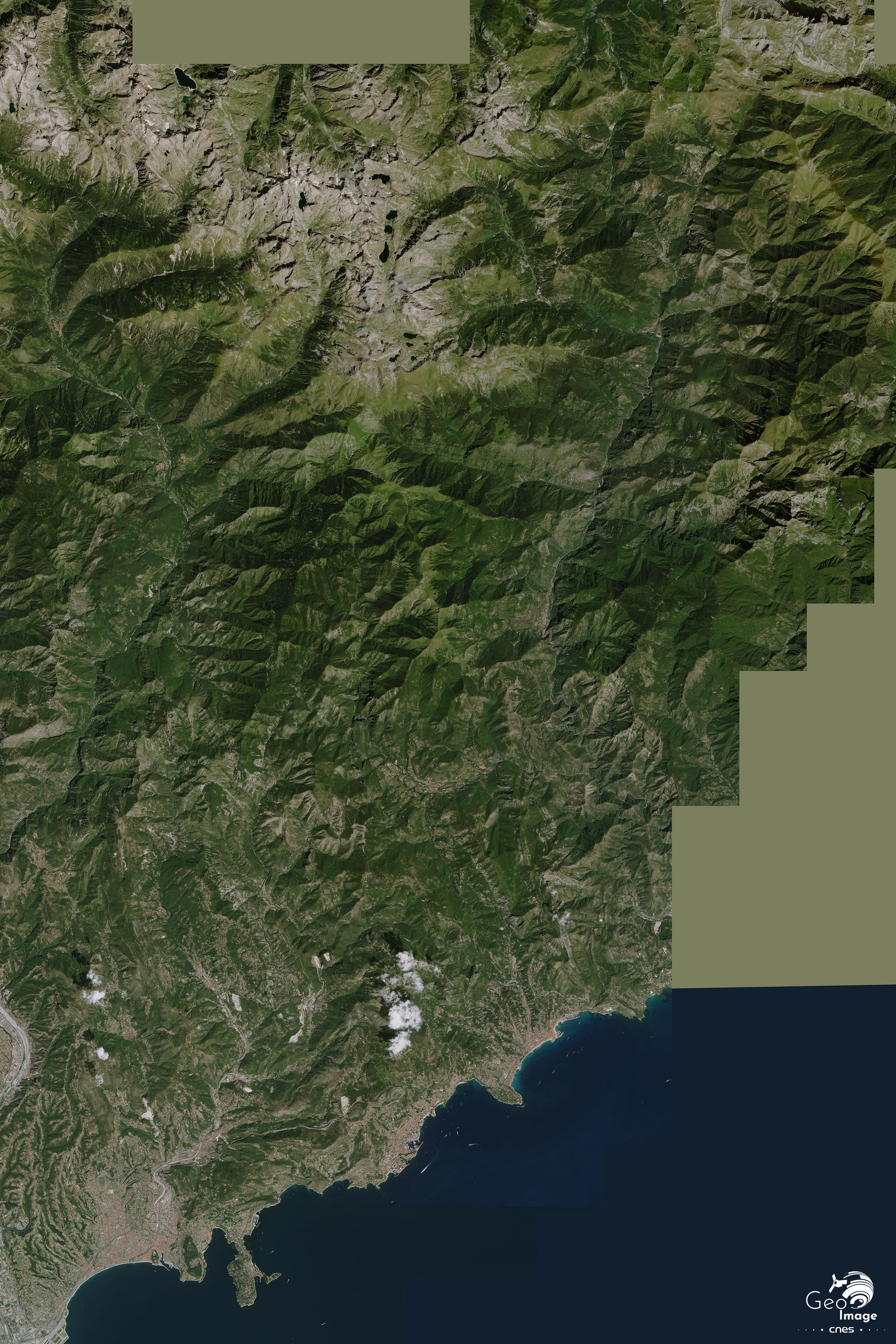 Le Haut-Pays, quant à lui, constitue 75 % du territoire présent sur cette image. Il se caractérise par des hauts sommets, notamment vers les crêtes frontalières. On rentre alors dans le massif du Mercantour-Argentera, avec les vallées encaissées de la Roya et le secteur des Merveilles, et, plus à l’Ouest, accessible par le col de Turini, de la Vésubie, avec les vallons de la Gordolasque, du Fenestre et du Boréon. Ici, la Cime du Gelas culmine à 3143 m. Nous ne sommes pourtant qu’à 50 km de la Méditerranée. La quasi-totalité de ce Haut-Pays est inclus dans le cœur du Parc national du Mercantour.