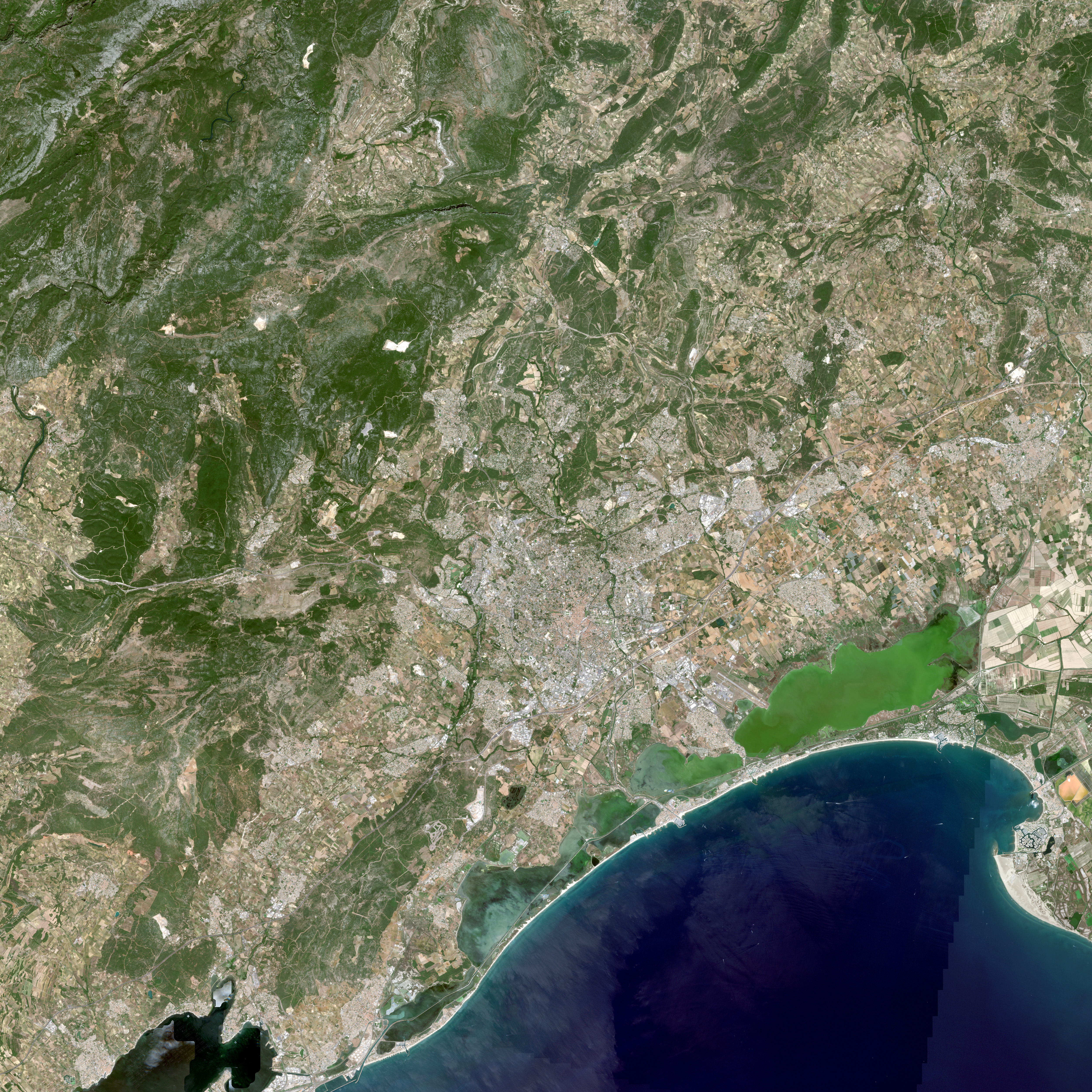 Image de Montpellier, ville du sud de la France située sur l'arc méditerranéen, entre Barcelone et Marseille. Cette image a été prise le 15 août 2018 par un satellite Sentinel-2. Il s’agit d’une image en couleurs naturelles, dont la résolution est de 20m.