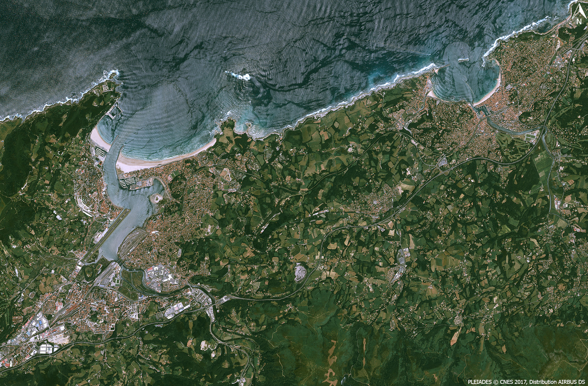 L’image est centrée sur la baie transfrontalière de Chigoundi (Txigundi en basque), embouchure de la Bidassoa qui sépare Hendaye-plage, ancienne zone dunaire transformé dès les années 1920 en quartier balnéaire, et Fontarrabie (Hondarribia en basque), dont le noyau ancien se distingue par la densité des bâtiments.