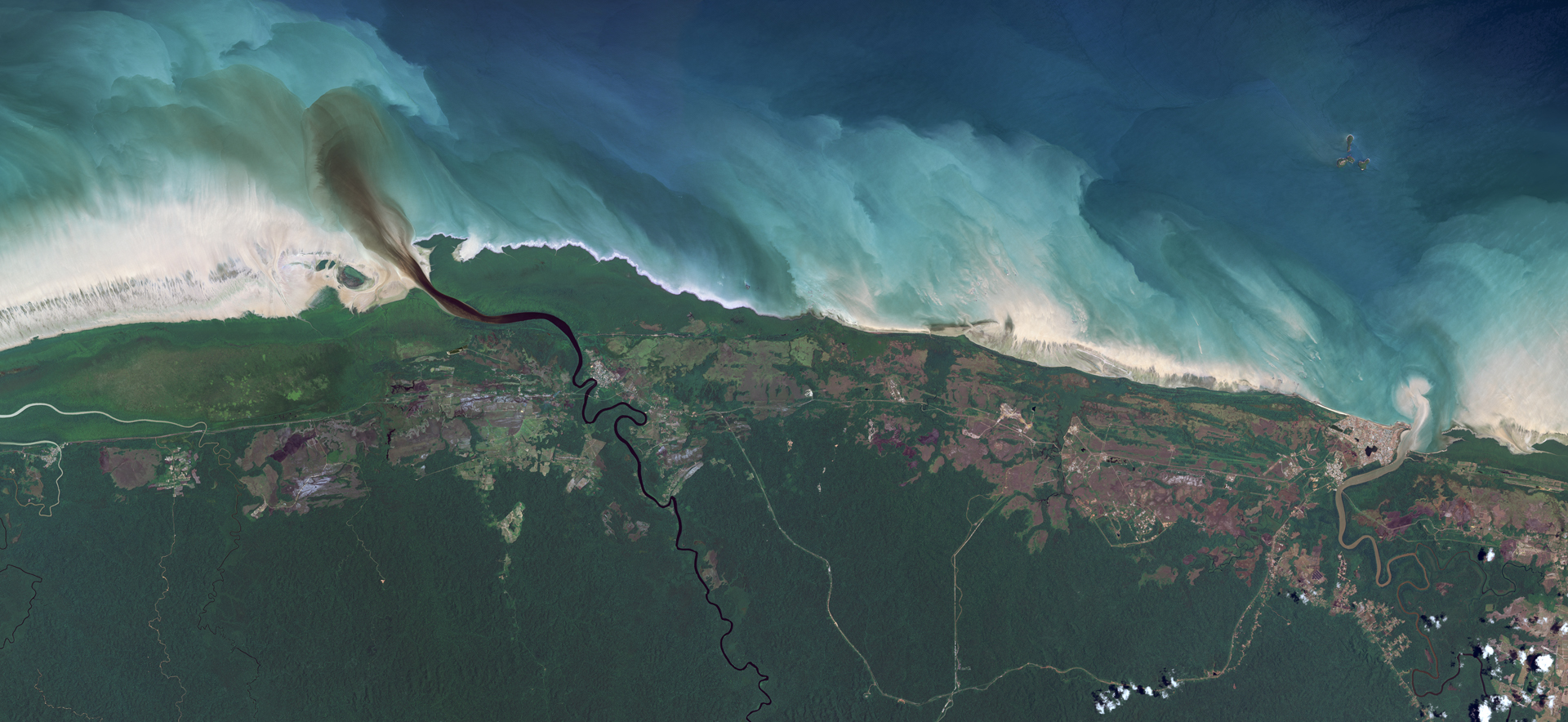 Cette image détaille encore davantage la mosaïque littorale guyanaise organisée en bandes paysagères parallèles au littoral, en raison de la configuration géomorphologique des sédiments. La confrontation des eaux fluviales du Sinnamary avec les eaux turbides littorales est spectaculaire, le panache des matières organiques déversées par le fleuve est bien visible car dissoutes, elles absorbent fortement la lumière d’où les teintes sombres. Le Sinnamary charrie aussi moins de sédiments que les autres fleuves guyanais car ils sont piégés en amont par le barrage de Petit Saut construit en 1994 pour fournir de l’électricité au CSG et à une population guyanaise en forte augmentation.