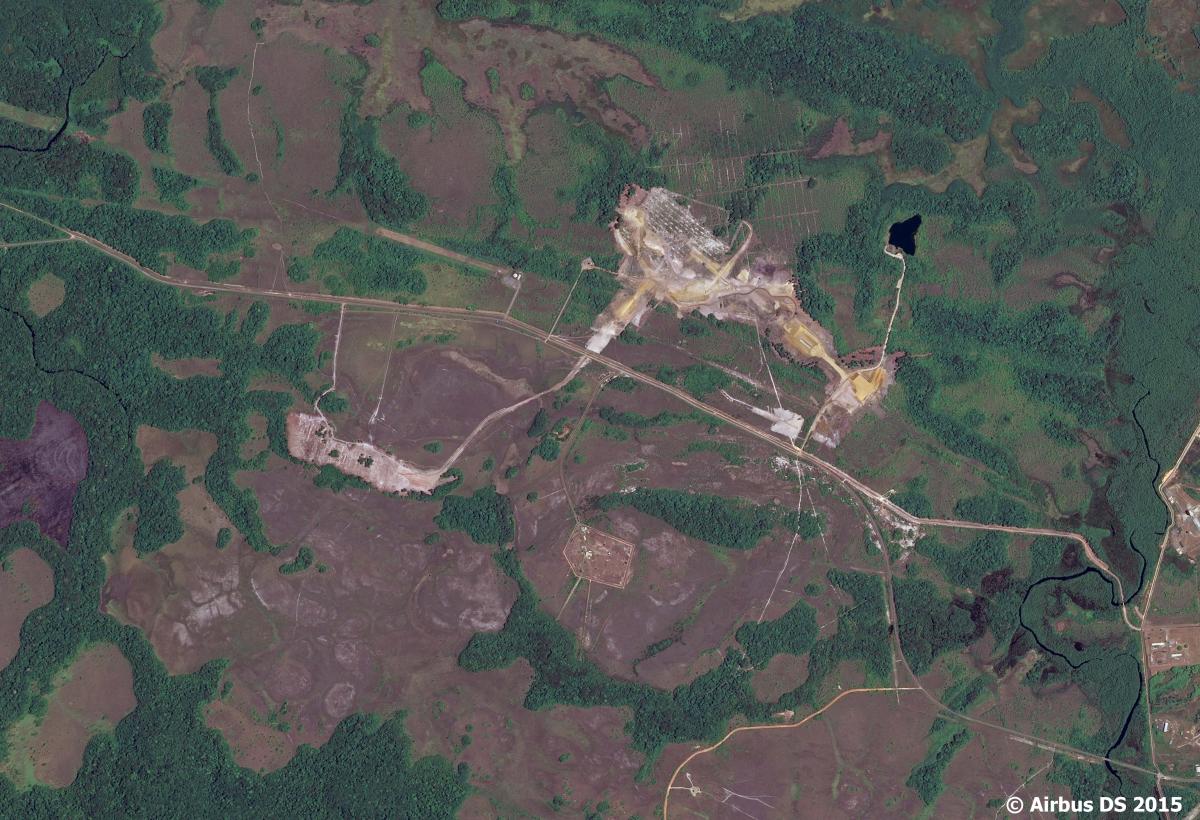 Cette image illustre l’emprise spatiale du CSG sur les savanes, avec le début de la construction du gigantesque pas de tir d’Ariane 6, le futur Ensemble de Lancement 4 (ELA4). Face à la concurrence mondiale et des projets comme l’américain Space X, Arianespace lance le programme Ariane 6 dont l’objectif est de diviser par deux les coûts de lancement, grâce en partie à un site de lancement simplifié. Le chantier du nouveau pas de tir débute en 2015 avec un premier lancement prévu en Juillet 2020.
