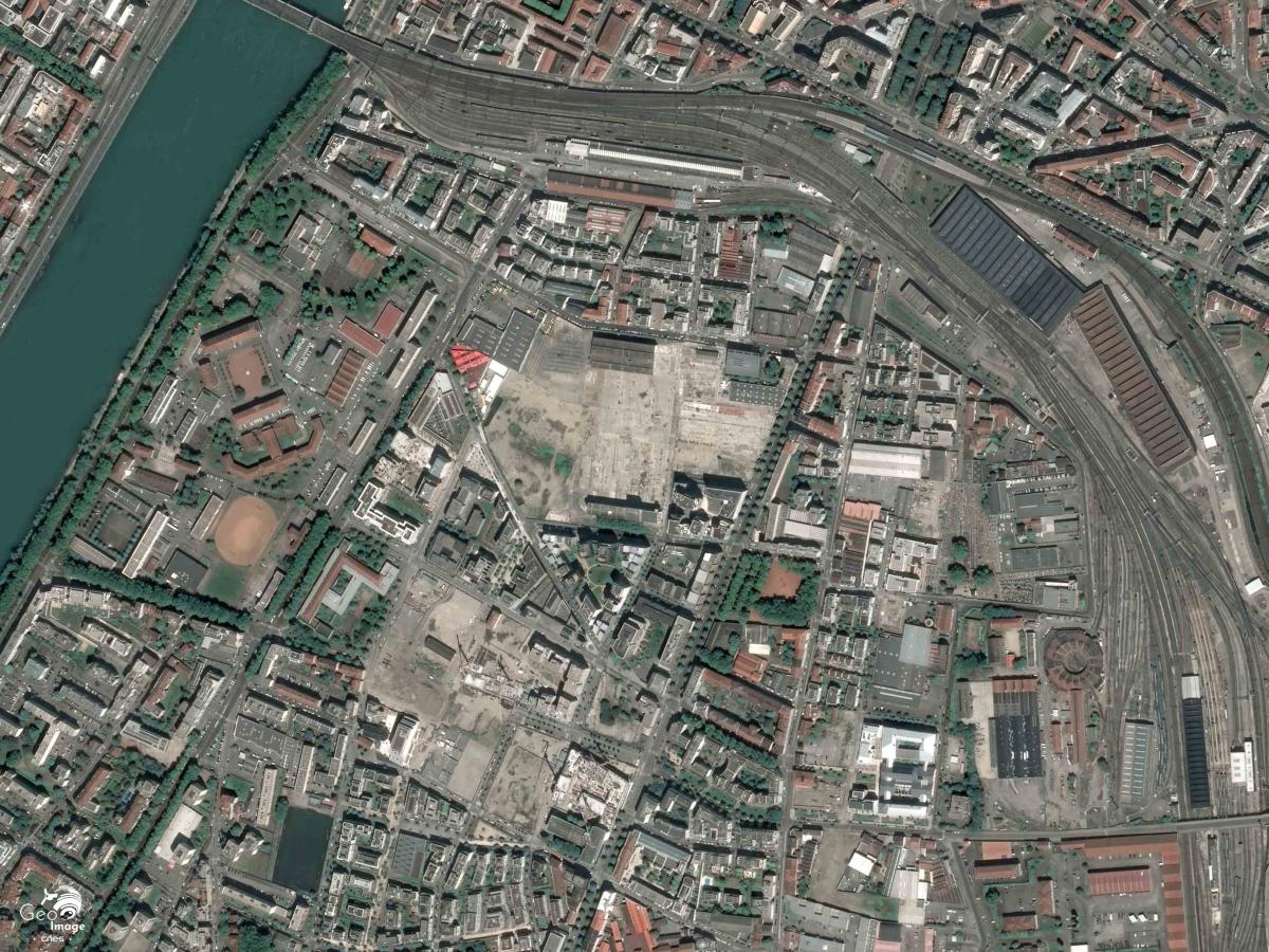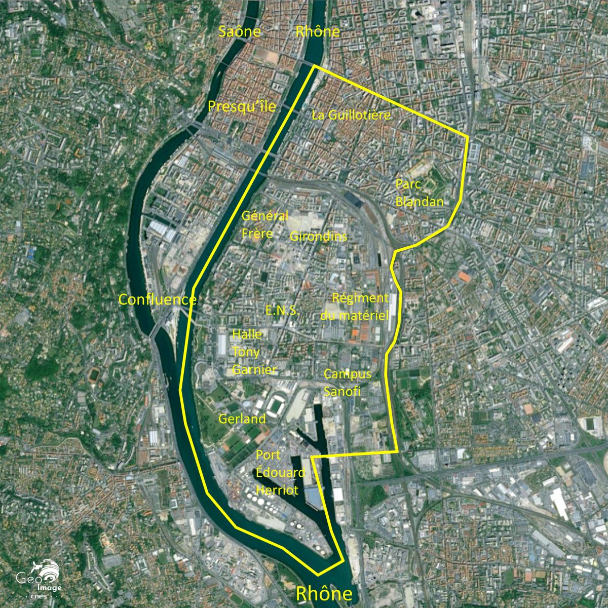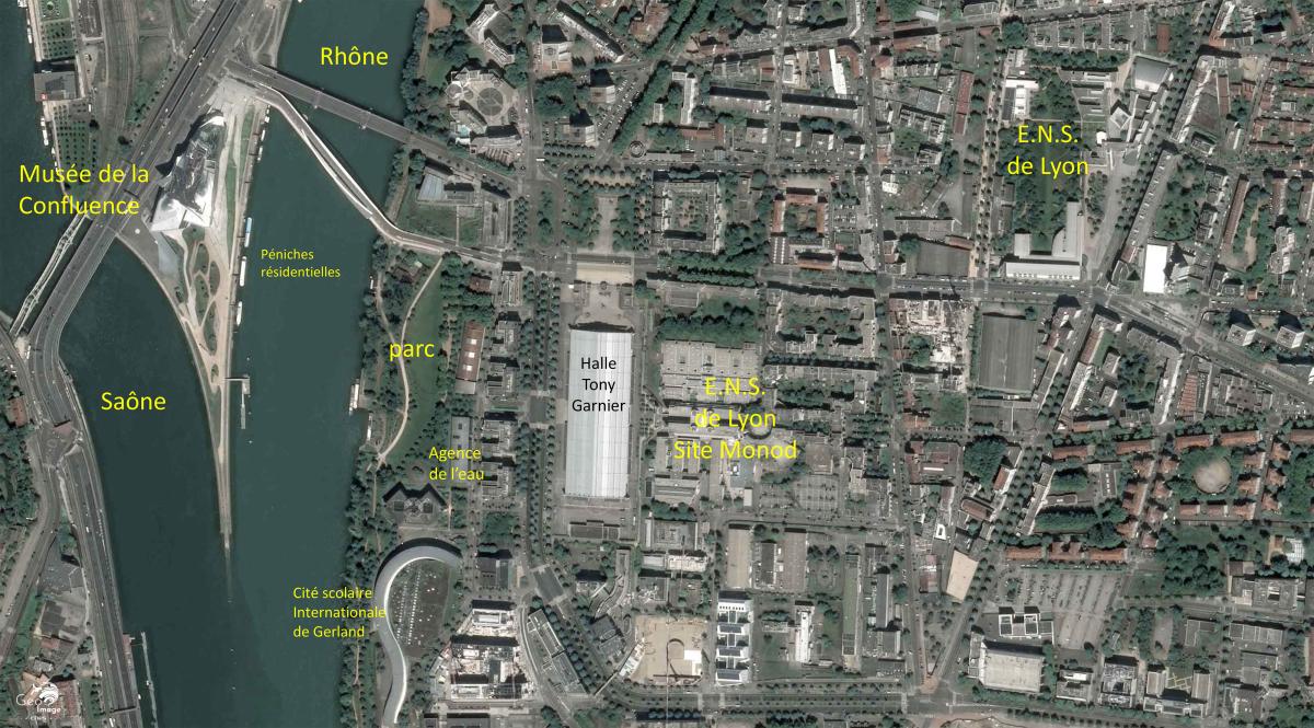 Au centre du zoom, on devine les locaux du site Monod de l’ENS (École Normale Supérieure) de Lyon. Ce site dédié aux sciences exactes et expérimentales est inauguré en 1987, et le site Descartes, voué aux lettres et aux sciences humaines et sociales, en 2000. Les deux ENS ont depuis fusionné pour ne former qu’une seule entité. Le site Descartes, visible dans l’angle nord-est du zoom, est construit sur l’ancienne usine Mure qui fabriquait des armatures en béton armé. Confié à l’architecte Henri Gaudin (1933-2021), elle signale déjà une ambition métropolitaine affichée par la municipalité au tournant du millénaire. Son jardin remarquable, visible sur l’image, a été réalisé par Gilles Clément dont il fut l’un des manifestes, le « juste jardin ».