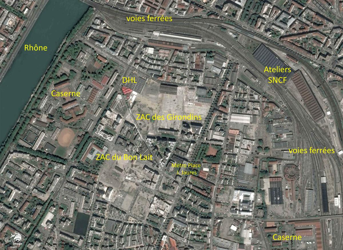 L’emprise foncière des voies ferrées qui relient les deux principales gares de la ville, Perrache sur la Presqu’île et Part-Dieu vers le nord, au réseau national en direction du sud, est bien visible sur la photographie. À l’exception du nord-ouest de l’arrondissement, les quartiers du 7e ont longtemps accueilli les fonctions nécessaires au développement urbain, mais considérées comme secondaires, consommatrices d’espaces ou génératrices de nuisance comme les transports ferroviaires, les casernes ou les cimetières.
