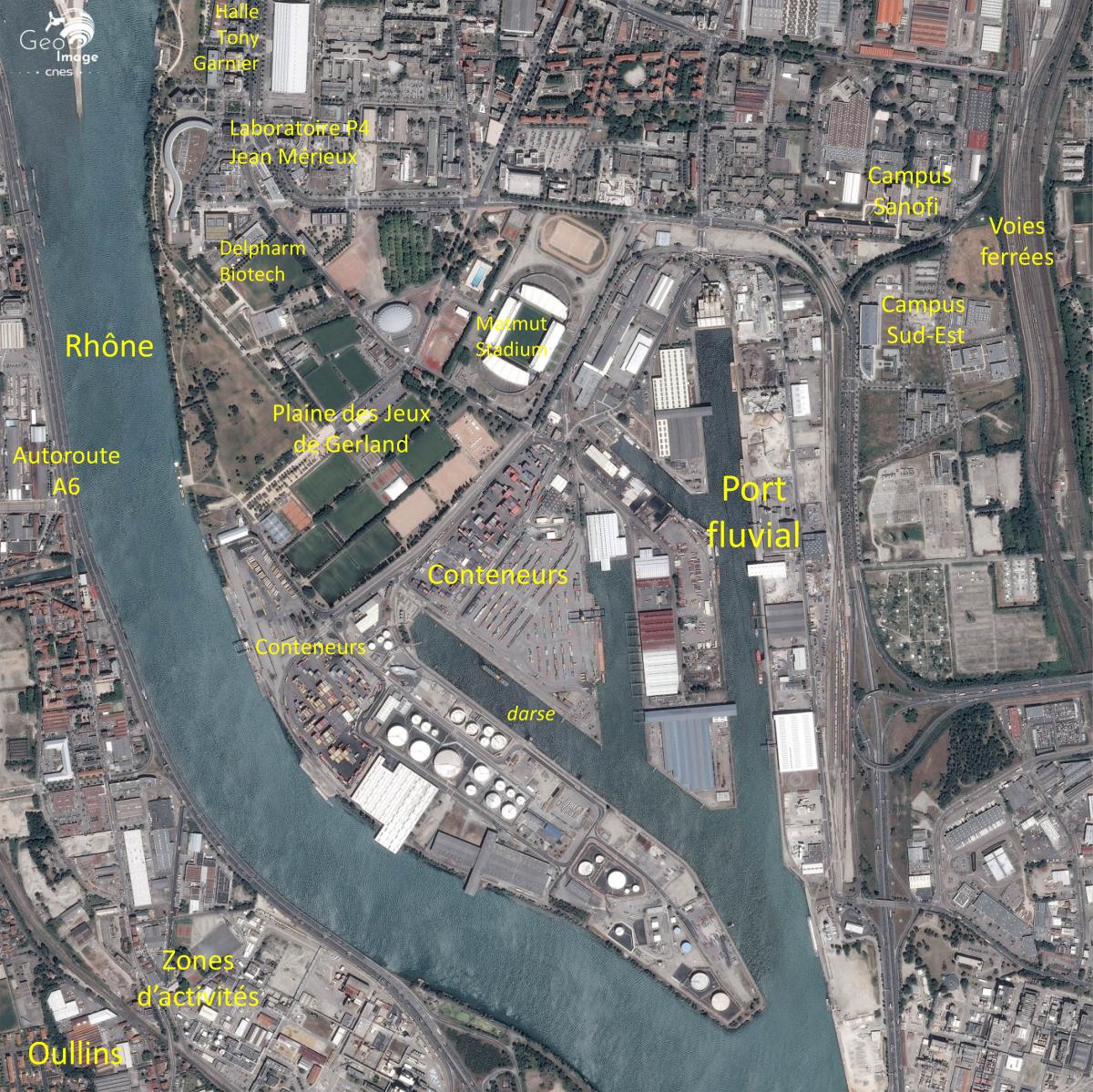 La partie la plus méridionale de la ville est consacrée principalement à deux fonctions métropolitaines : la fonction de loisirs avec le parc et le stade de Gerland, et la fonction portuaire avec le port Édouard Herriot.