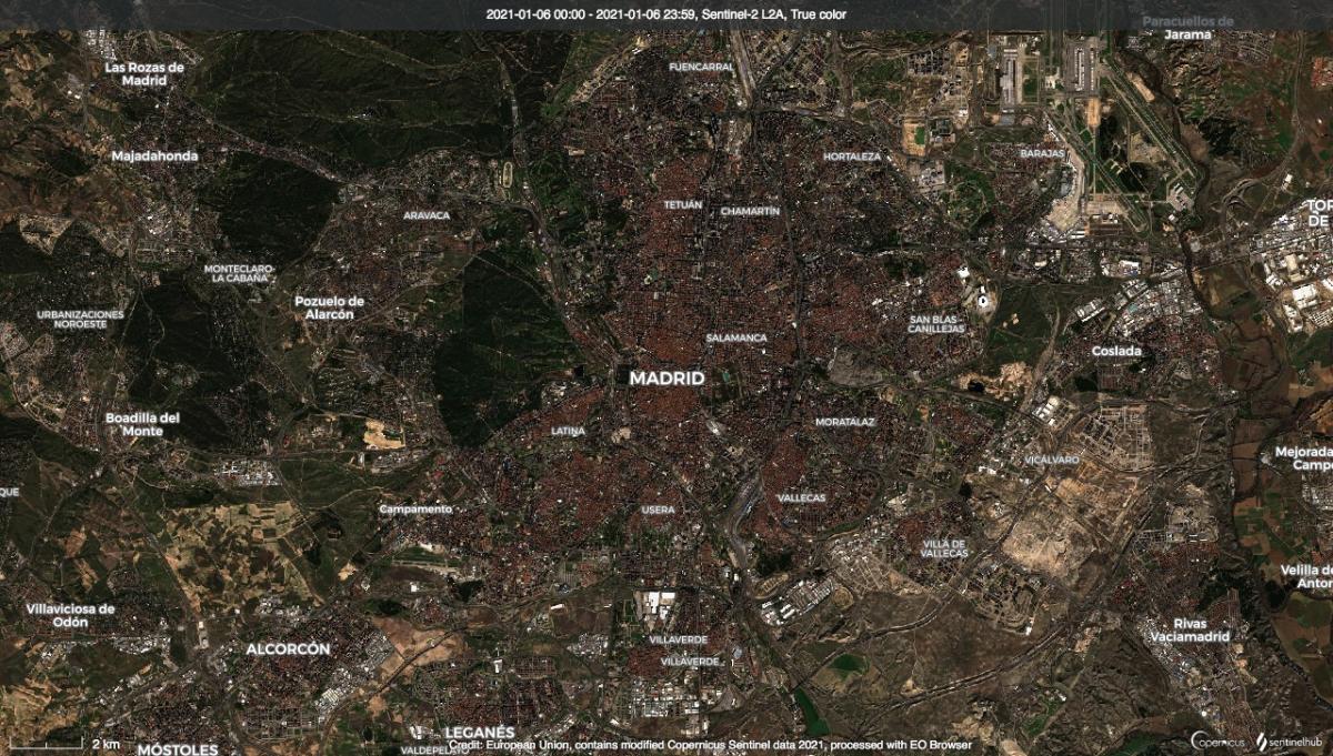 En la mañana del sábado 9, la capital se despertó paralizada. Escenas inusuales de batallas gigantes de bolas de nieve, esquiadores en la Gran Vía hicieron la alegría de las redes sociales y de los medios de comunicación. Sin embargo, el Ayuntamiento de Madrid pidió al Gobierno la ayuda del Ejército para despejar algunos ejes vertebradores de la ciudad, en particular los accesos a hospitales, sensibles en esta época de reanudación epidémica en la Comunidad de Madrid. La Comunidad de Madrid anunció entonces la suspensión de las actividades educativas hasta el 18 de enero. El 11 de enero, algunas pistas del aeropuerto de Barajas fueron finalmente despejadas con el fin de permitir algunos vuelos de mercancías, especialmente para el transporte de vacunas COVID: las pistas negras son claramente visibles al noreste de la imagen. Ese mismo día, se reabrió la autopista M30, pero sólo el 10% de las calles de Madrid fueron despejadas de nieve.