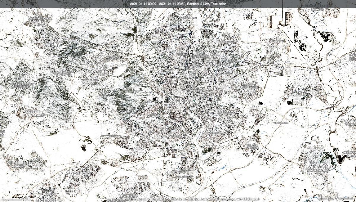 Esta nevada de amplitud excepcional comenzó en Madrid el 8 de enero: la capa de nieve alcanzó rápidamente los 30 cm en el centro de la capital, y hasta 50 centímetros en los distritos este y sur. La comparación entre las dos imágenes satelitales fechadas del 6 y el 11 de enero habla por sí sola. Este episodio invernal fue excepcionalmente intenso, la última "nevada" comparable fue en 1971. Por lo tanto, no es raro experimentar nevadas en Madrid, pero en cantidades mucho más modestas (10 a 15 cm): la continentalidad de su ubicación y su altitud bastante elevada en el corazón de la Meseta (667 m en la Puerta del Sol) explican el duro clima de Castilla. Los madrileños están acostumbrados a citar el proverbio: "Madrid, nueve meses de invierno, tres meses de infierno" (en referencia a los veranos ardientes).