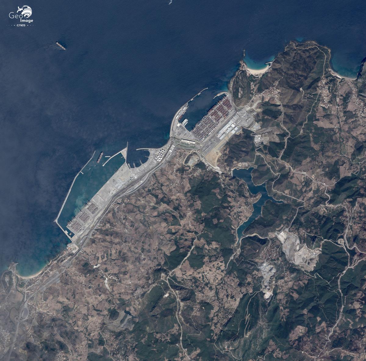 Les différents espaces portuaires se distinguent bien depuis l’espace. Tout au sud, le port de Ksar Sghir, encore isolé du reste du complexe, abrite une base de la Marine Royale depuis 2008, en lien avec le développement des activités de Tanger-Med et plus largement avec la surveillance de la navigation dans le détroit de Gibraltar.