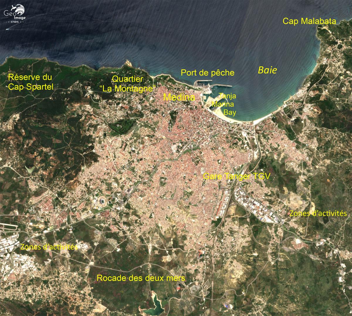 Elle dispose d’un site naturel exceptionnel face à un littoral qui tombe globalement dans la mer : une large baie, bien abritée, dont l’arc de cercle presque parfait occupe la moitié est de notre image. Une longue plage s’y étire jusqu’au Cap Malabata. A l’ouest, le paysage est plus tourmenté : la côte, escarpée, n’est pas urbanisée et des parcs et forêts soulignent de leur vert sombre le relief des collines. Des sentiers y mènent touristes et promeneurs au travers de la réserve naturelle du Cap Spartel, du nom du promontoire qui ouvre le détroit de Gibraltar.