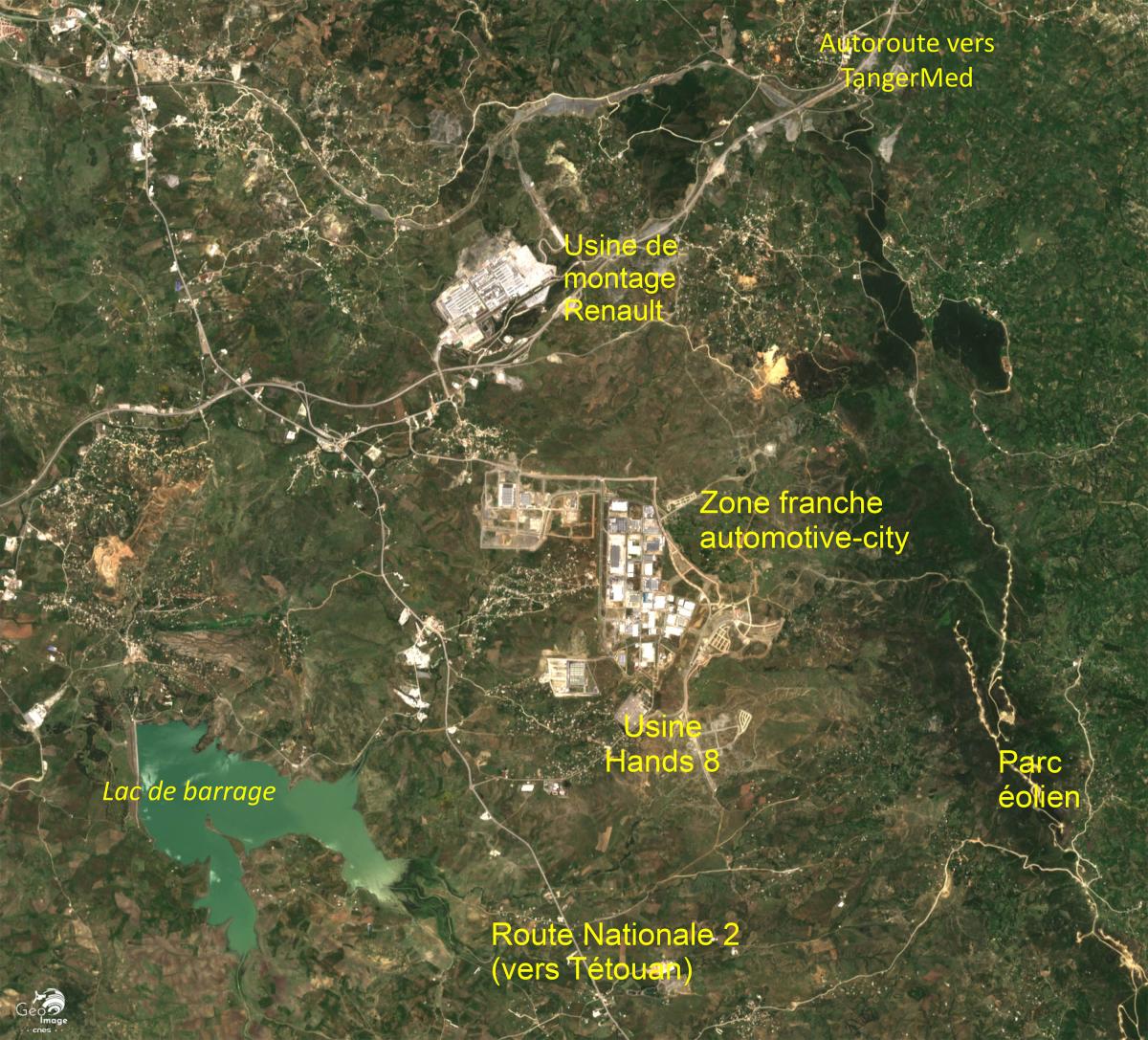 Deux zones industrielles créées ex-nihilo en pleine campagne se distinguent sur ce zoom d’étude à 15 km au sud-est de Tanger : l’usine Renault-Tanger, le long de l’autoroute sur la commune de Melloussa, et, en retrait au sud de celle-ci, la zone franche “Automotive City” qui accueille les fournisseurs de la marque au losange. Faisant 1,6 km de long sur 900 m de large, l’usine de montage apparait comme un complexe industriel très compact et intégré immédiatement relié à l’autoroute A4.
