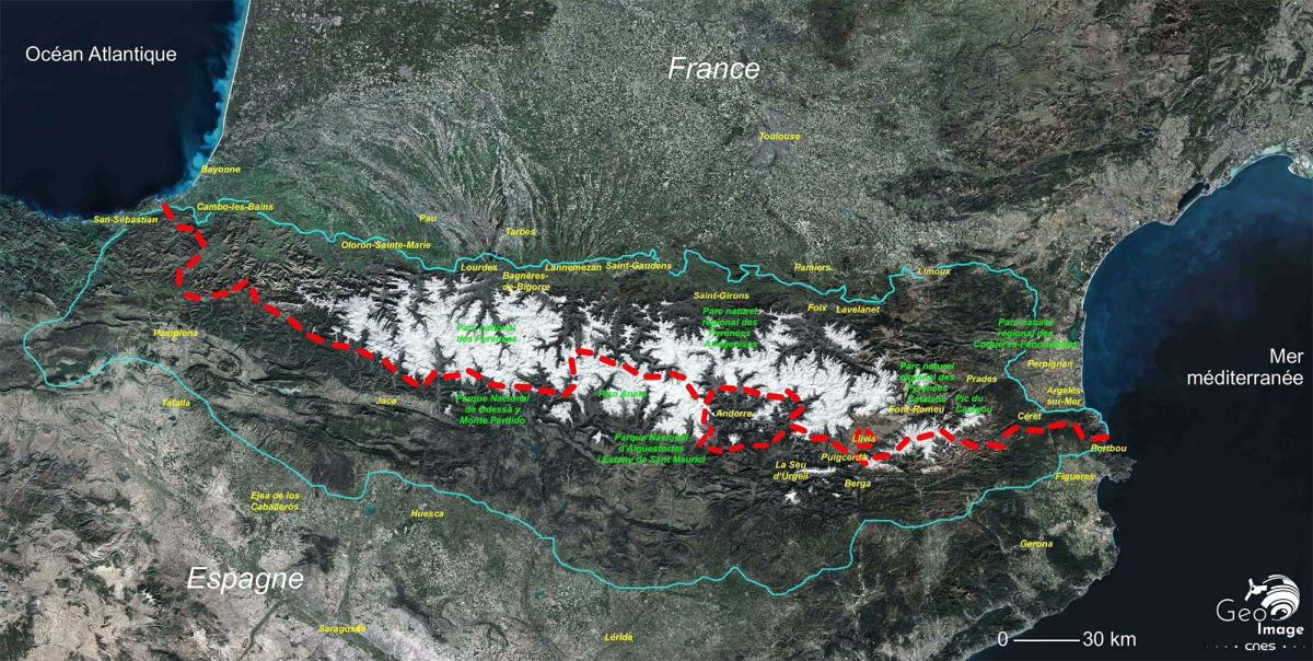 Le manteau neigeux qui recouvre les sommets à ce moment de l’année permet de distinguer les grandes vallées qui structurent cette chaîne de montagne. Au-delà, les couleurs de l’image satellite permettent de délimiter, par-delà le massif pyrénéen, deux grands milieux, homogènes tant d’un point de vue morphologique, que de celui des paysages. La plus grande partie de l’image concerne la partie française, où de grandes plaines sont soumises à une influence océanique, le milieu méditerranéen dominant la partie est. Au Sud, côté espagnol, on observe un paysage de plateaux au climat plus continental et méditerranéen.