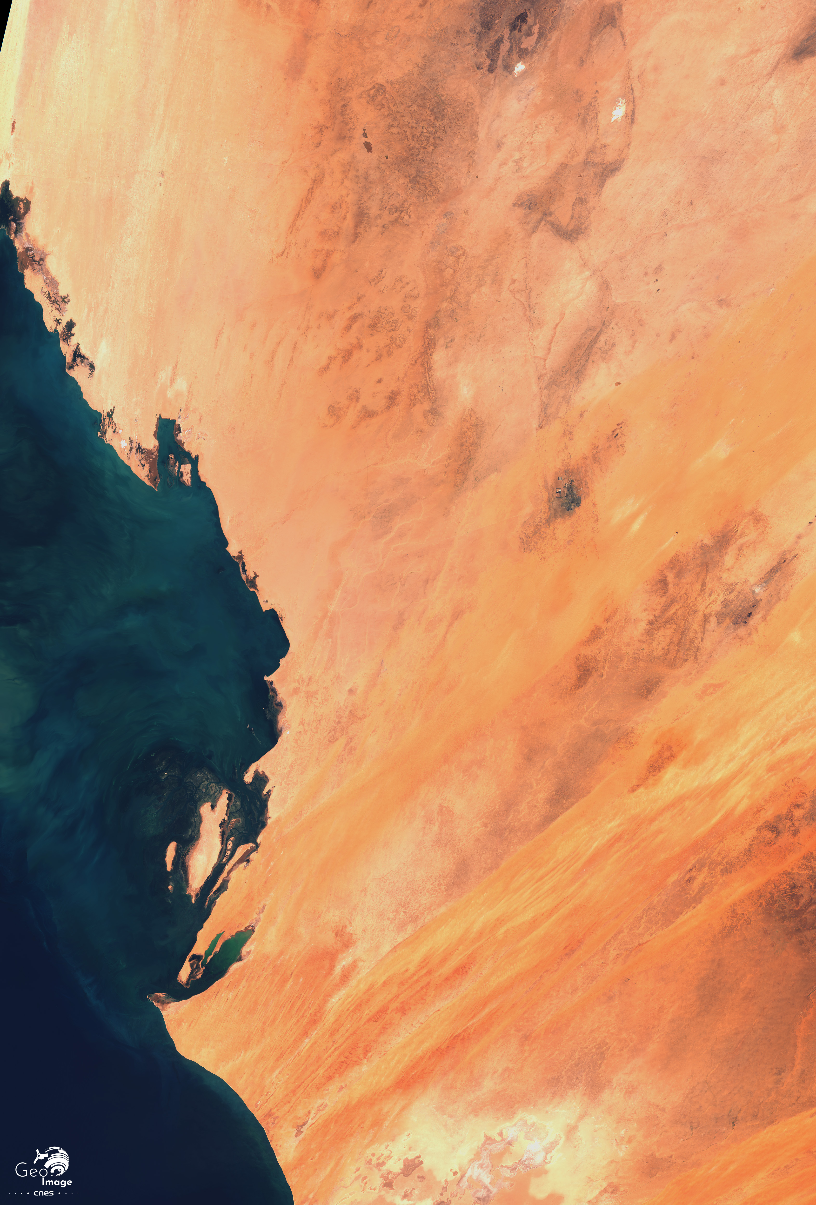 La côte septentrionale de la Mauritanie est bordée par le Golfe d’Arguin qui est bien visible sur l’image globale. Il constitue la partie marine du Parc national du Banc d’Arguin qui comprend aussi une bande continentale désertique d’une quarantaine de kilomètres de large.