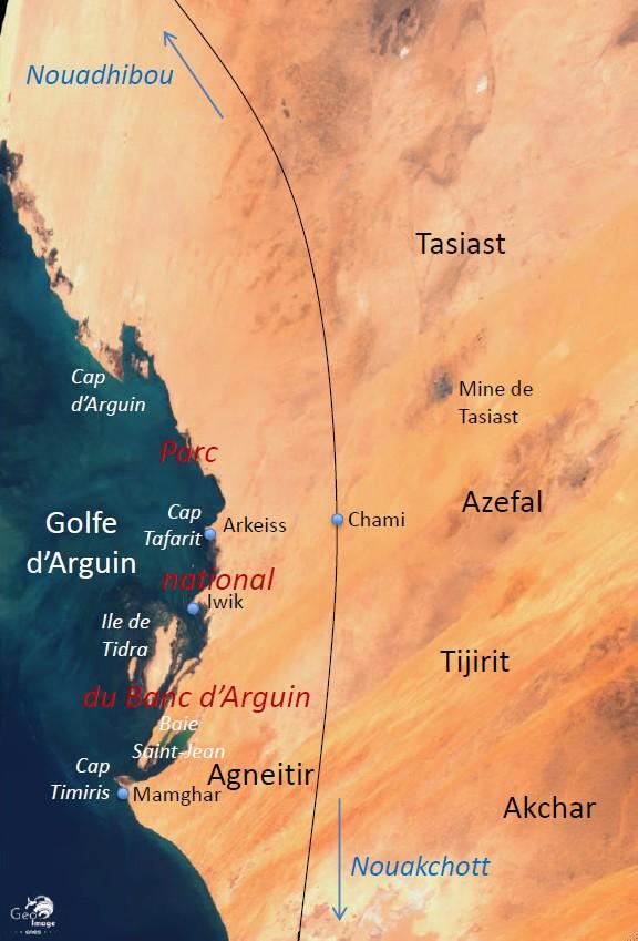 La portion du rivage visible sur l’image agrandie est celle de la partie méridionale du parc national : au sud, le cap Timiris, au bout duquel se trouve le village de Mamghar, marque la limite du Parc national du Banc d’Arguin. Mamghar était avant la construction de la route goudronnée un point de passage obligé pour la totalité des trafics alors que le village se trouve désormais à l’écart des flux de circulation. La comparaison entre les deux recensements de 2000 et de 2008 donne une bonne illustration des conséquences de l’ouverture de la route sur l’activité de ce village : la population y est passée de 944 habitants avant la mise en service de la route à 462 après celle-ci, soit un recul de moitié.