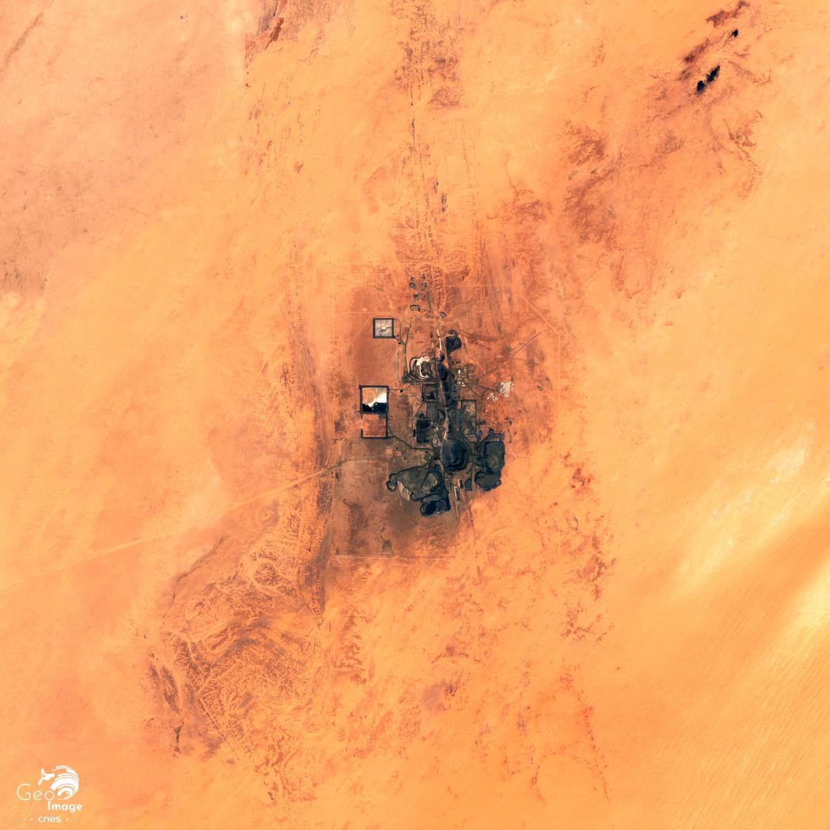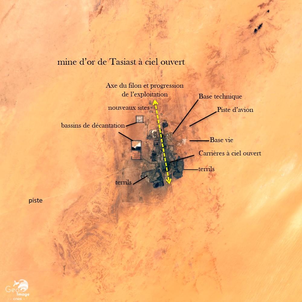 Il s’agit d’une mine à ciel ouvert ; les cavités correspondant aux carrières sont bien visibles sur l’image, de couleur sombre. Cette extraction produit aussi de nombreux débris stériles accumulés en terrils, eux aussi bien visibles. La mine emploie près de 4.000 personnes et son personnel est en cours de « mauritanisation ». Située à 300 kilomètres au nord-est de Nouakchott, le site ne se trouve qu’à une soixantaine de kilomètres de la limite du Parc national.