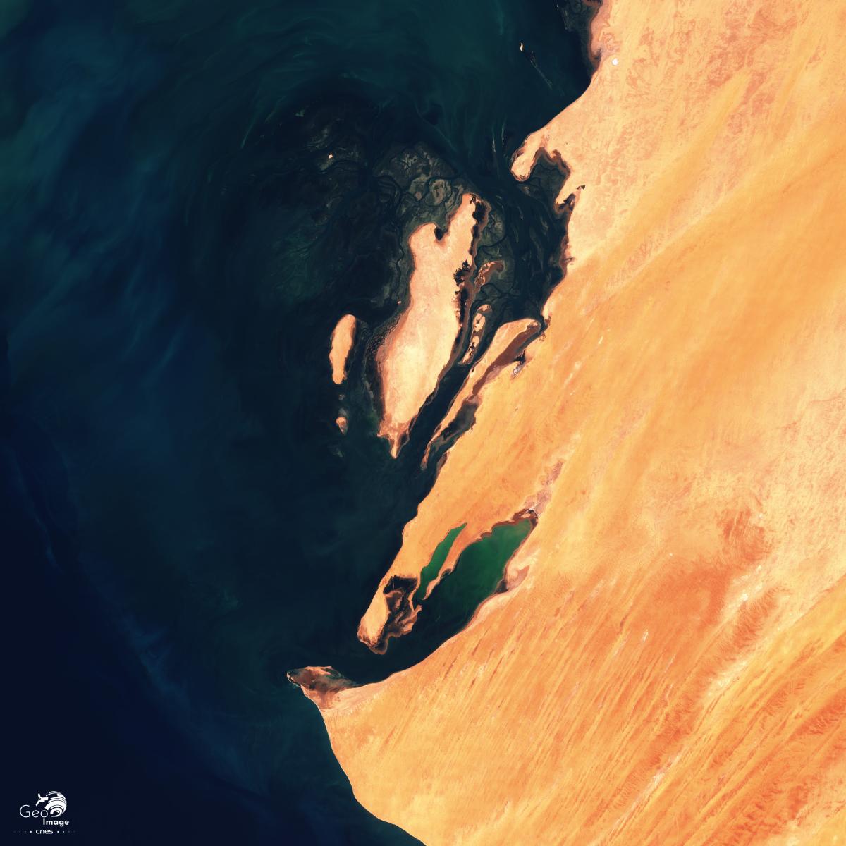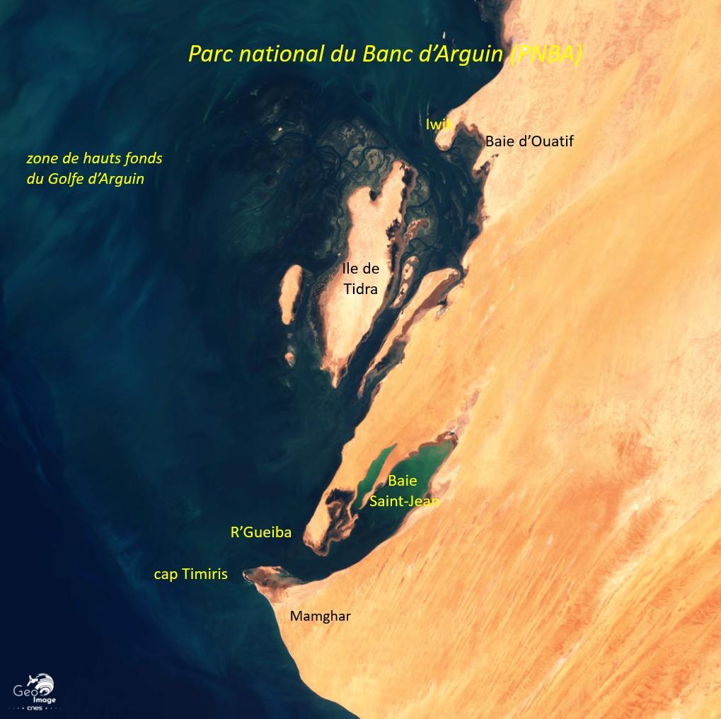 La côte septentrionale de la Mauritanie est bordée par le Golfe d’Arguin qui est bien visible sur l’image globale. Il constitue la partie marine du Parc national du Banc d’Arguin qui comprend aussi une bande continentale désertique d’une quarantaine de kilomètres de large.