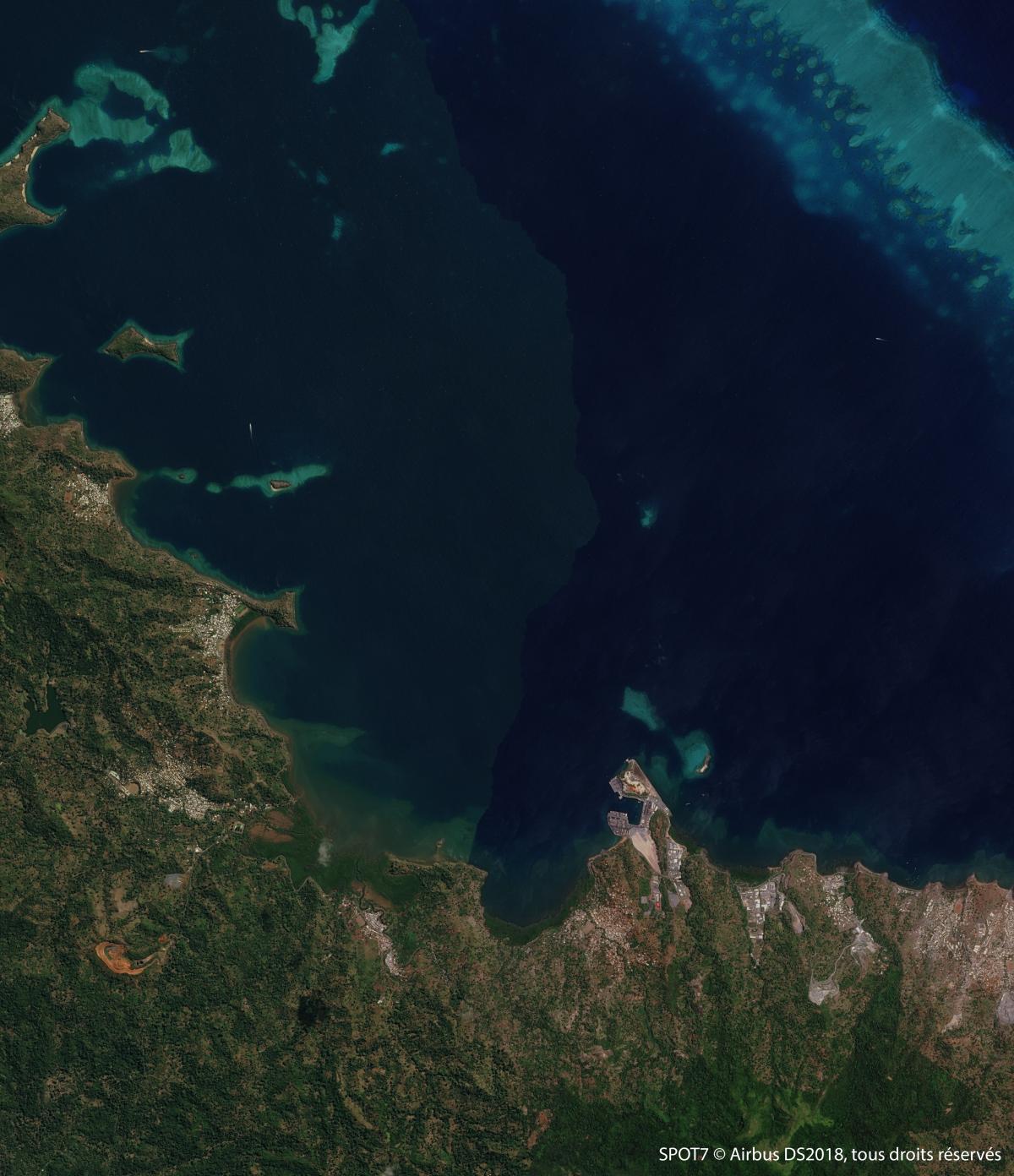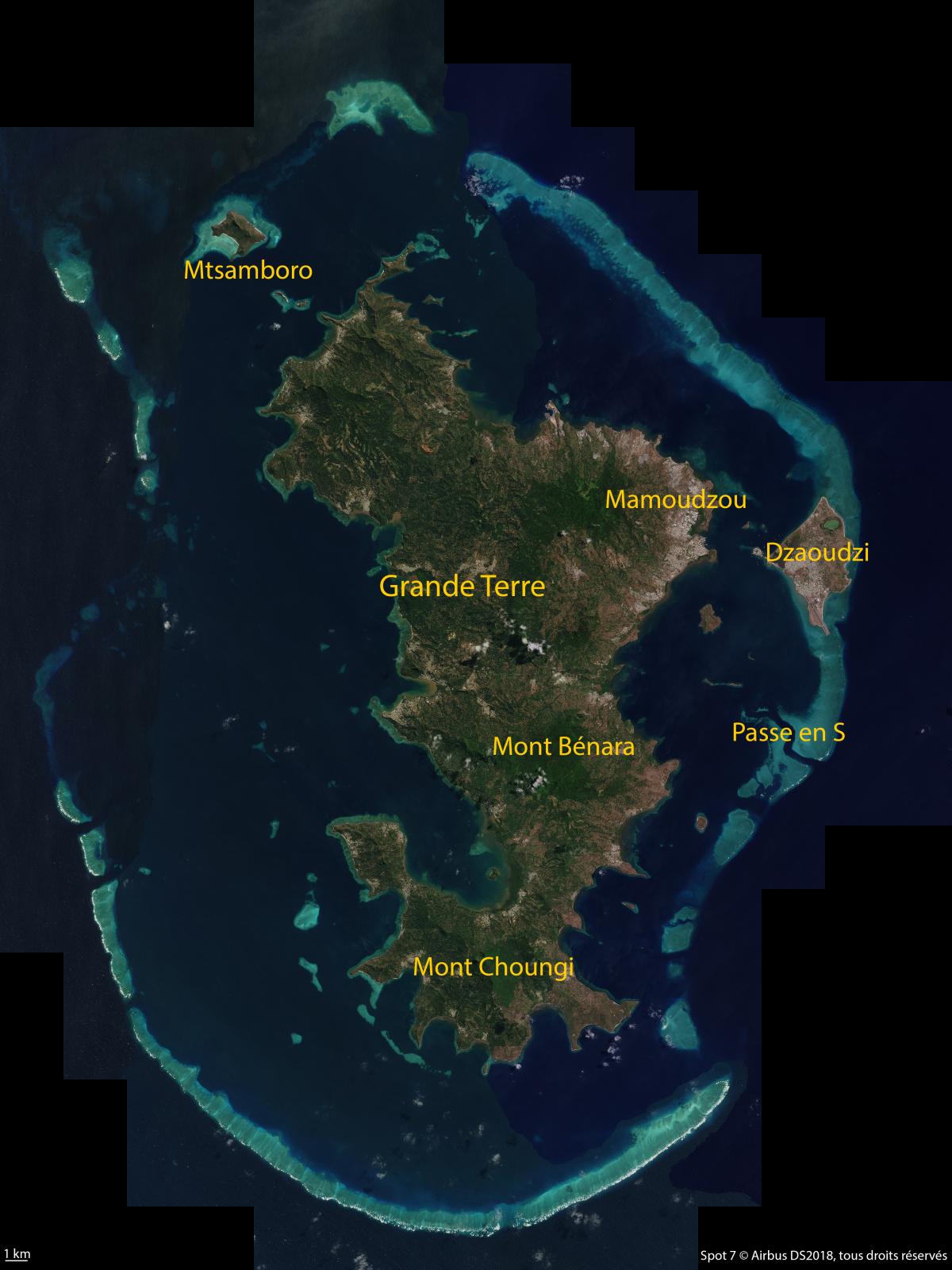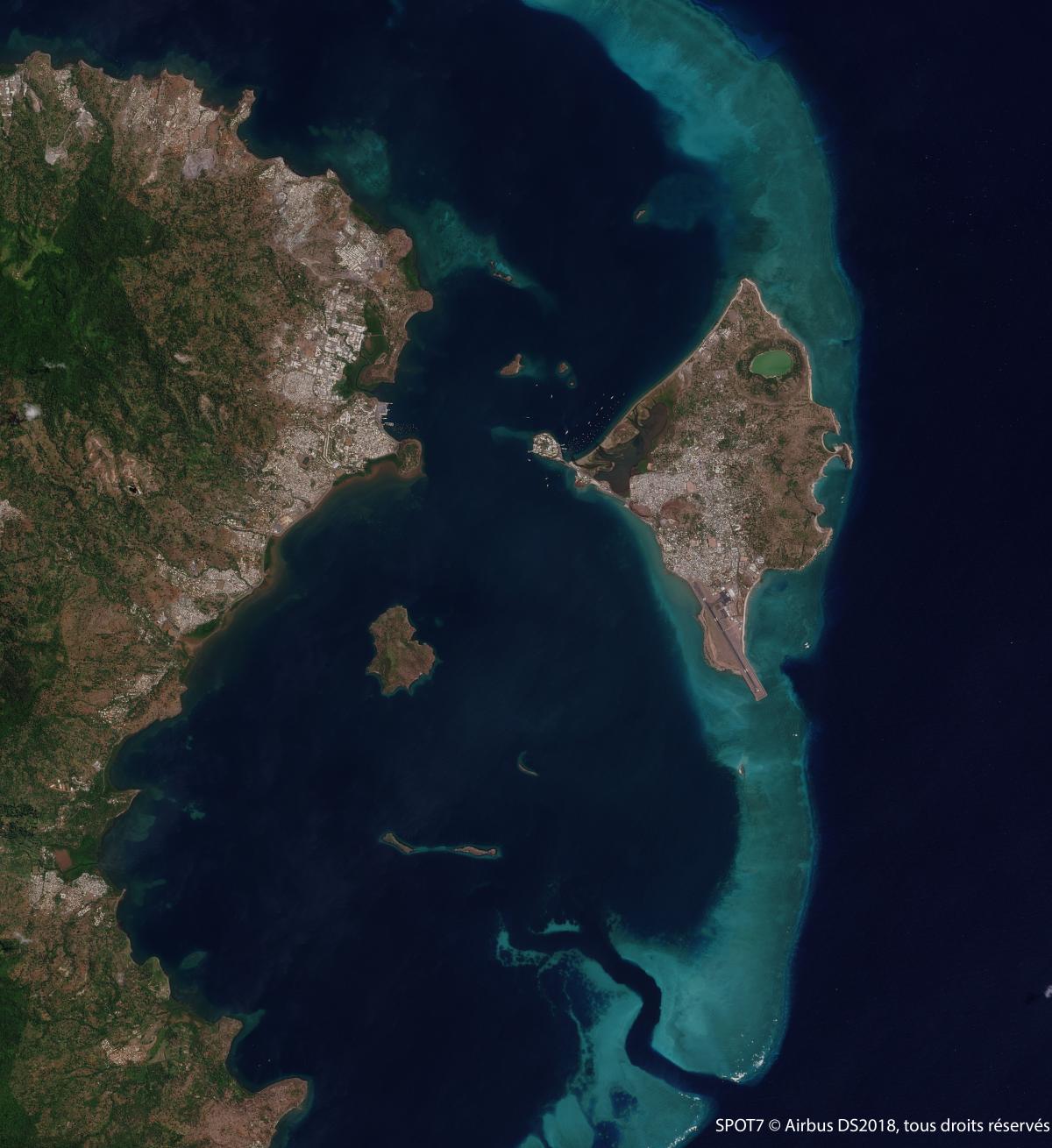 Cette image de Mayotte, archipel de l'océan Indien situé entre Madagascar et la côte du Mozambique a été prise le 3 mars 2018 par un satellite SPOT 7. Il s’agit d’une image en couleurs naturelles.