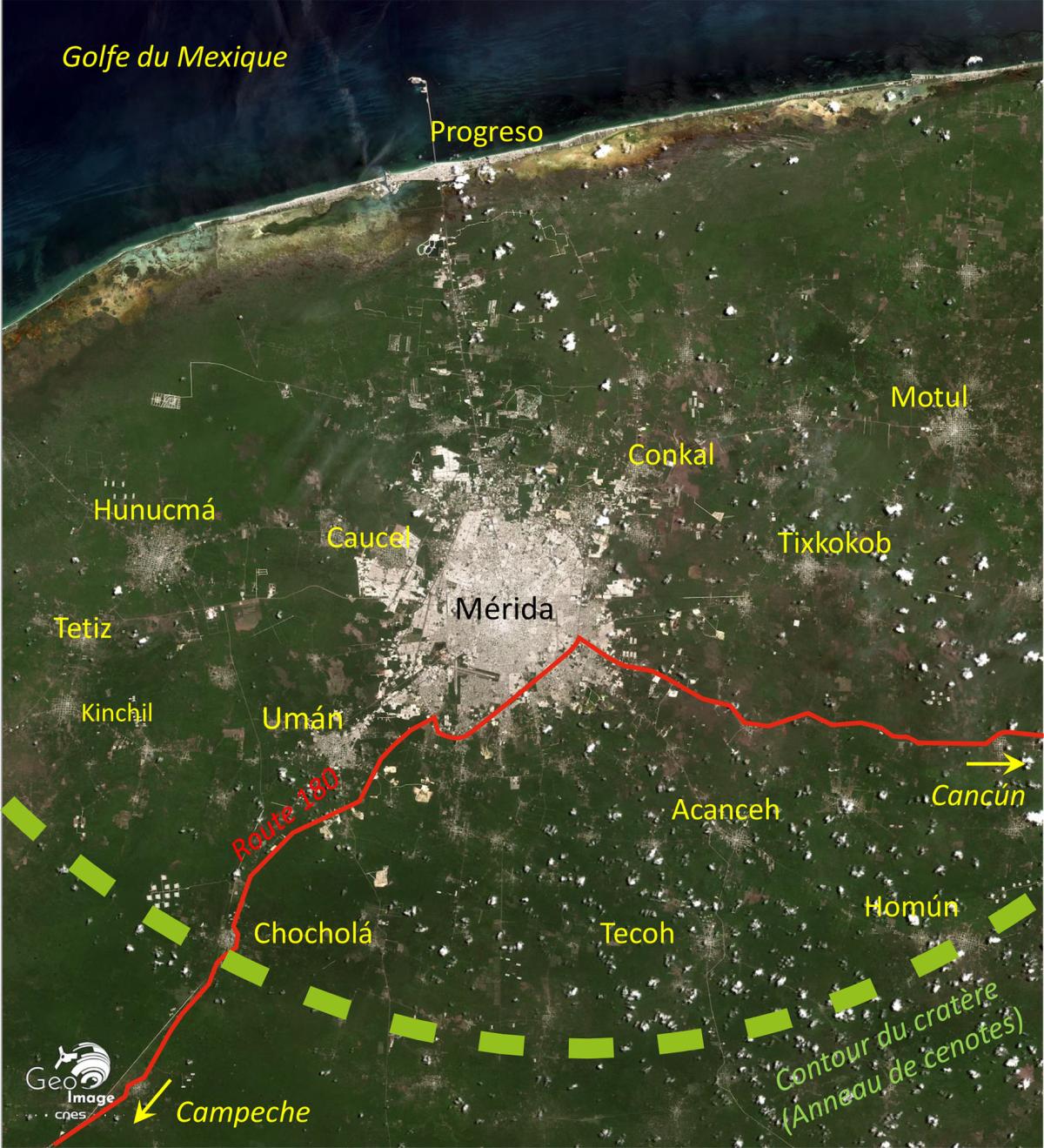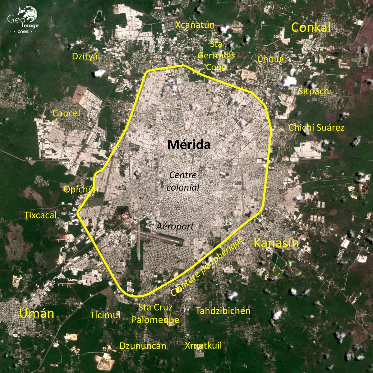 En el centro de la imagen está Mérida, la capital de la entidad federativa. A 36 km al norte, el puerto de Progreso, en el Golfo de México, ofrece una apertura internacional, especialmente hacia América del Norte. Al suroeste, la carretera federal 180 conecta la ciudad con el resto del país.
