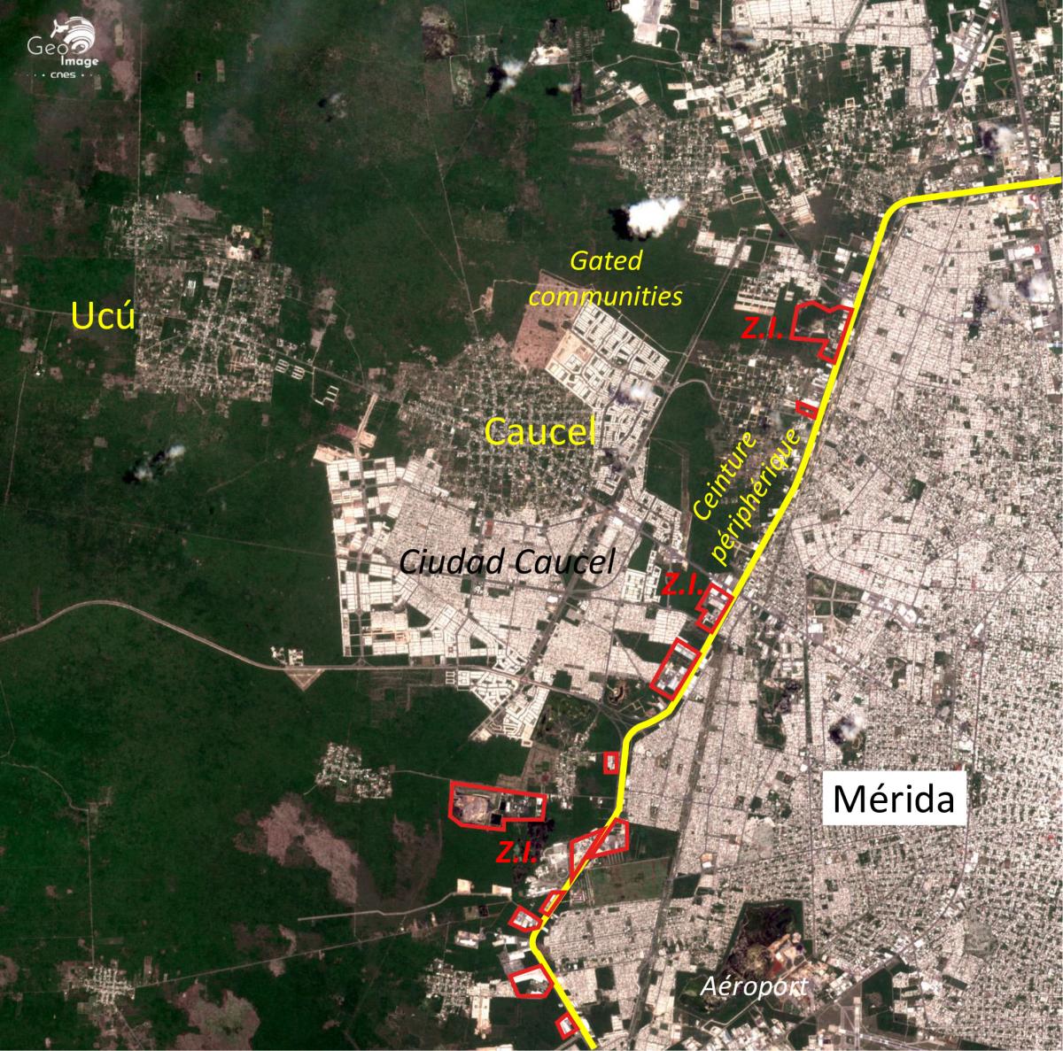 Al norte de Mérida, una gran carretera recta, claramente visible en la imagen, une la capital con el puerto de Progreso. La proximidad del puerto ha favorecido sin duda el establecimiento de algunas empresas especializadas en el transporte por carretera. Sin embargo, la dinámica que está configurando actualmente esta zona está más relacionada con la urbanización residencial, dirigida a las clases superiores.