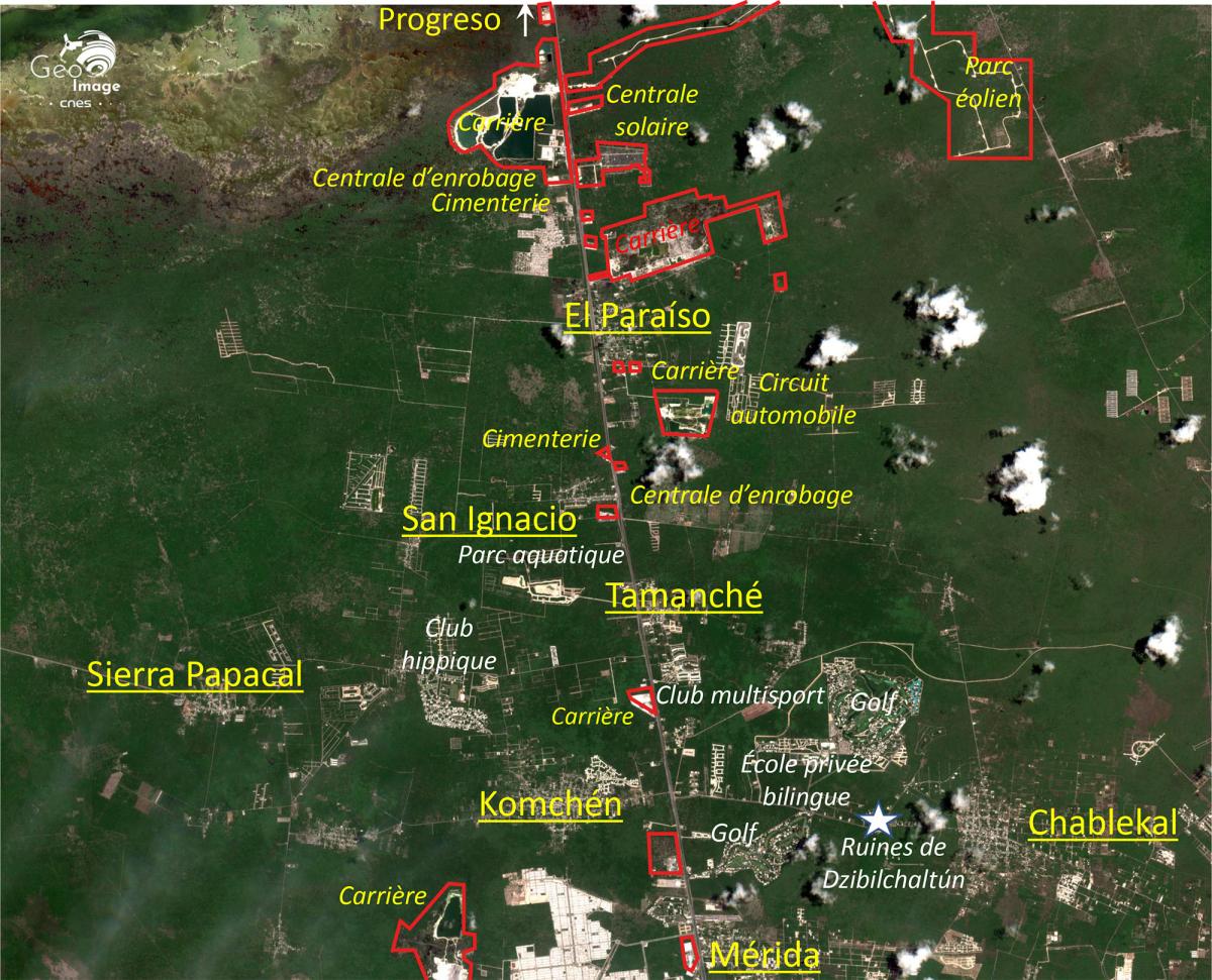 Los terrenos de ambos lados de este eje están especialmente expuestos a la especulación inmobiliaria. Observamos claramente las carreteras ya construidas tal como las que están construyendo, para urbanizaciones cerradas de alta gama, algunas de ellas destinadas al sector turístico. La zona es estratégica por su proximidad a las playas de Progreso, la ciudad colonial de Mérida y el sitio arqueológico de Dzibilchaltún.