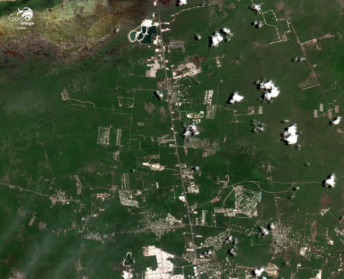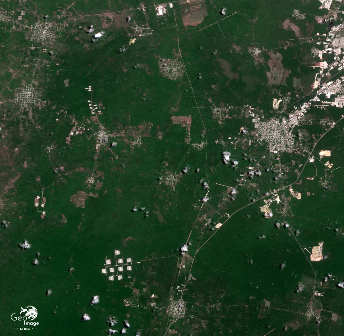 La imagen muestra la parte noroccidental del estado de Yucatán, en el sureste de México. Esta región se encuentra en el corazón del cráter de Chicxulub, que fue creado hace más de 66 millones de años por la caída de un meteorito. Se cree que este episodio fue la causa de las extinciones masivas, incluida la de los dinosaurios.