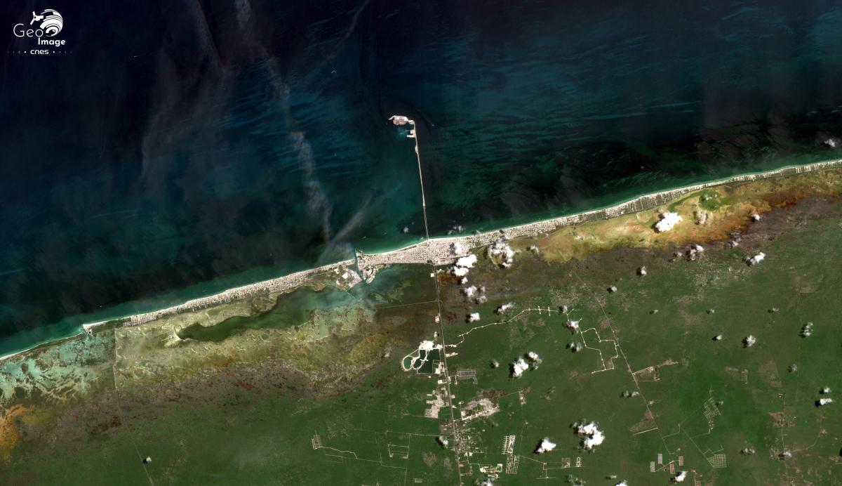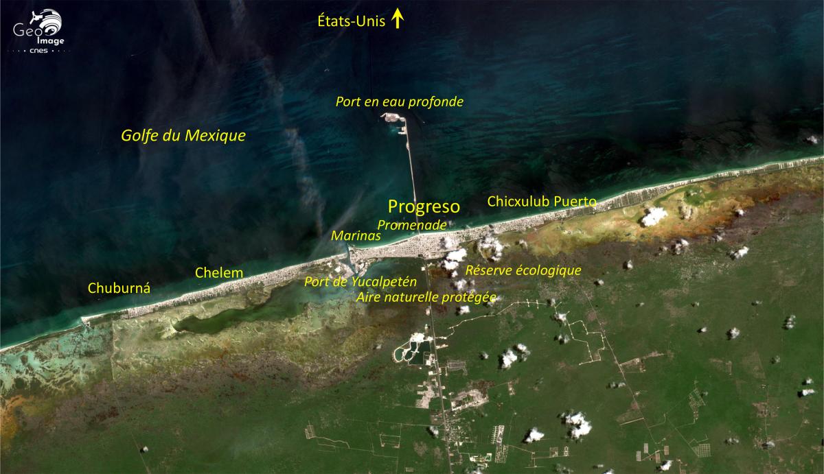 Con una proyección de casi 6,5 km en el Golfo de México a través de un largo dique, el puerto de aguas profundas de Progreso es particularmente visible en esta imagen. Constituye una pieza clave de la infraestructura regional y una verdadera ventaja para el desarrollo económico de Yucatán. Al abrirse a América del Norte, pero también a los mercados europeos y asiáticos, el puerto de aguas profundas tiene una doble función.