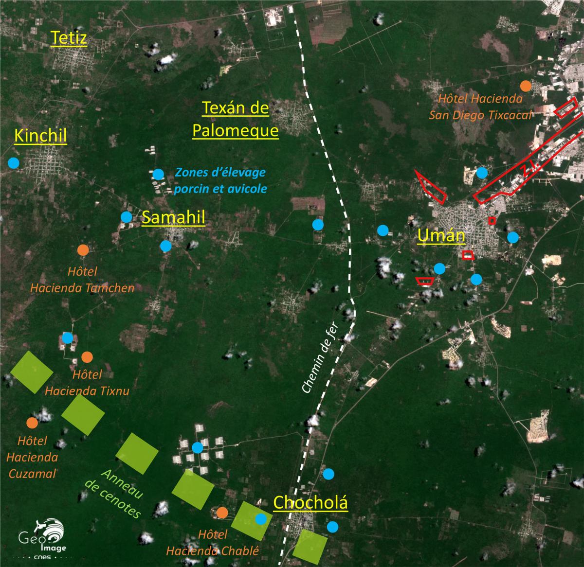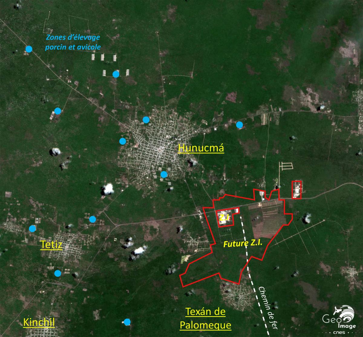 Estas dos imágenes cubren la franja oeste/suroeste de la región. Al igual que el corredor norte de la metrópoli, este espacio se está reorganizando bajo el efecto de la dinámica económica contemporánea. Sin embargo, los procesos que destacan estas imágenes son diferentes a los observados en el eje Mérida-Progreso. Los municipios de la franja occidental son hoy en día en el centro de las políticas de reindustrialización del Estado. Las zonas industriales se multiplican, principalmente cerca de Hunucmá y Tetiz.