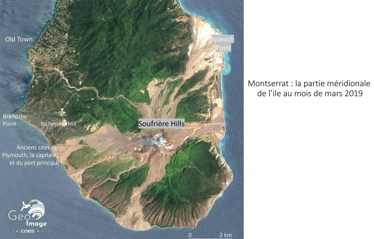 Toutefois, l’intérêt de cette image est aussi dans ce que l’on ne voit pas du fait des coulées de lave car les principales infrastructures portuaires ainsi que l’ancienne capitale Plymouth autrefois situées au Sud-Ouest de l’île ont aujourd’hui disparu avec les éruptions volcaniques tout comme l’ancien aéroport international situé à l’Est. D’ailleurs les coulées de lave ont eu pour conséquence d’accroître le trait de côte sur la mer à l’est et au sud de l’île.
