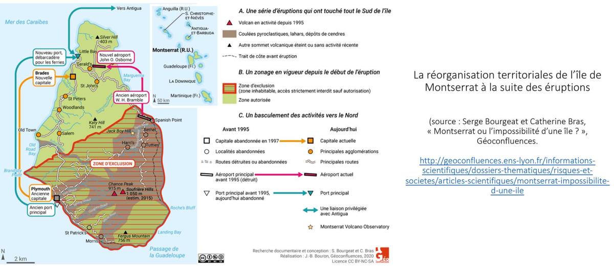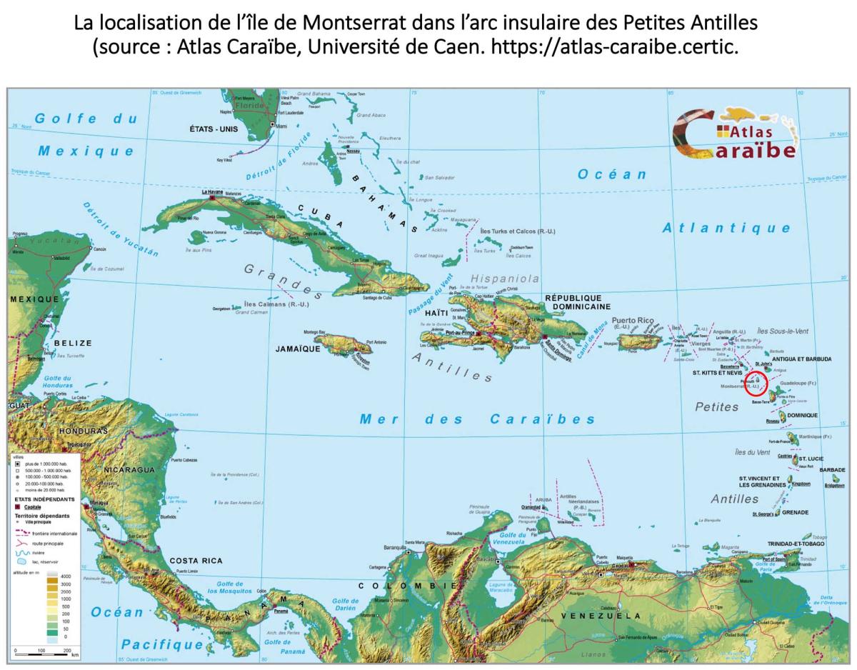 Découverte en 1493 et prise par les britanniques en 1632, Montserrat est aujourd’hui un territoire d’outre- mer britannique des petites Antilles situé entre la Guadeloupe et Antigua. L’île est à l’image des petites Antilles de par son caractère volcanique, ses aménités paysagères - forêts tropicales, plages de sable noir, massif volcaniques … - et touristiques, sa forte exiguïté (102 km2) et la confrontation aux risques, tant telluriques que climatiques (cyclones). Ces éléments sont décisifs pour comprendre les dynamiques environnementales à l’œuvre et prendre en compte l’état et l’évolution de son organisation territoriale. Ainsi, les éruptions survenues entre 1995 et 1997 ont fortement touché le sud de l’île, impactant sa population, ses activités et son organisation par une reterritorialisation au Nord de l’île et le développement d’une nouvelle forme de tourisme.