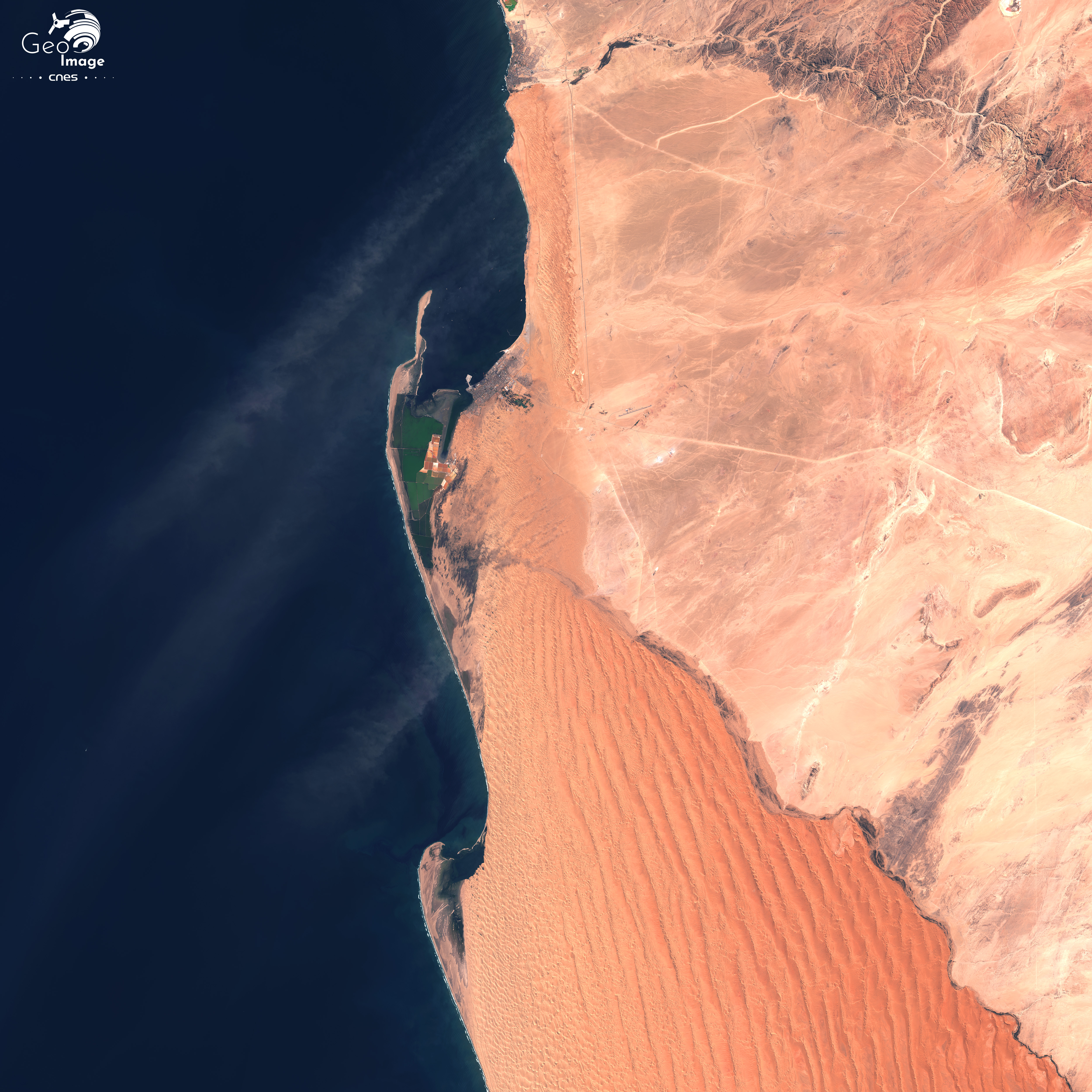 Enfin, au plan morphologique comme le montre l’image, le trait de côte se caractérise par la présence d’importantes flèches de sable, plus ou moins longues et surtout bien orientées du sud vers le nord selon le sens du courant. Elles isolent des lagunes plus ou moins étendues en particulier au sud de Walvis Bay et de Sandwich Harbour.