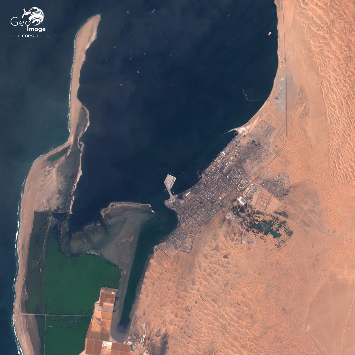Cette image de Walvis Bay, ville portuaire située sur la côte de la Namibie, a été prise le 23 août 2019 par le satellite Sentinel-2A. Il s’agit d’une image en couleurs naturelles de résolution à 10m.