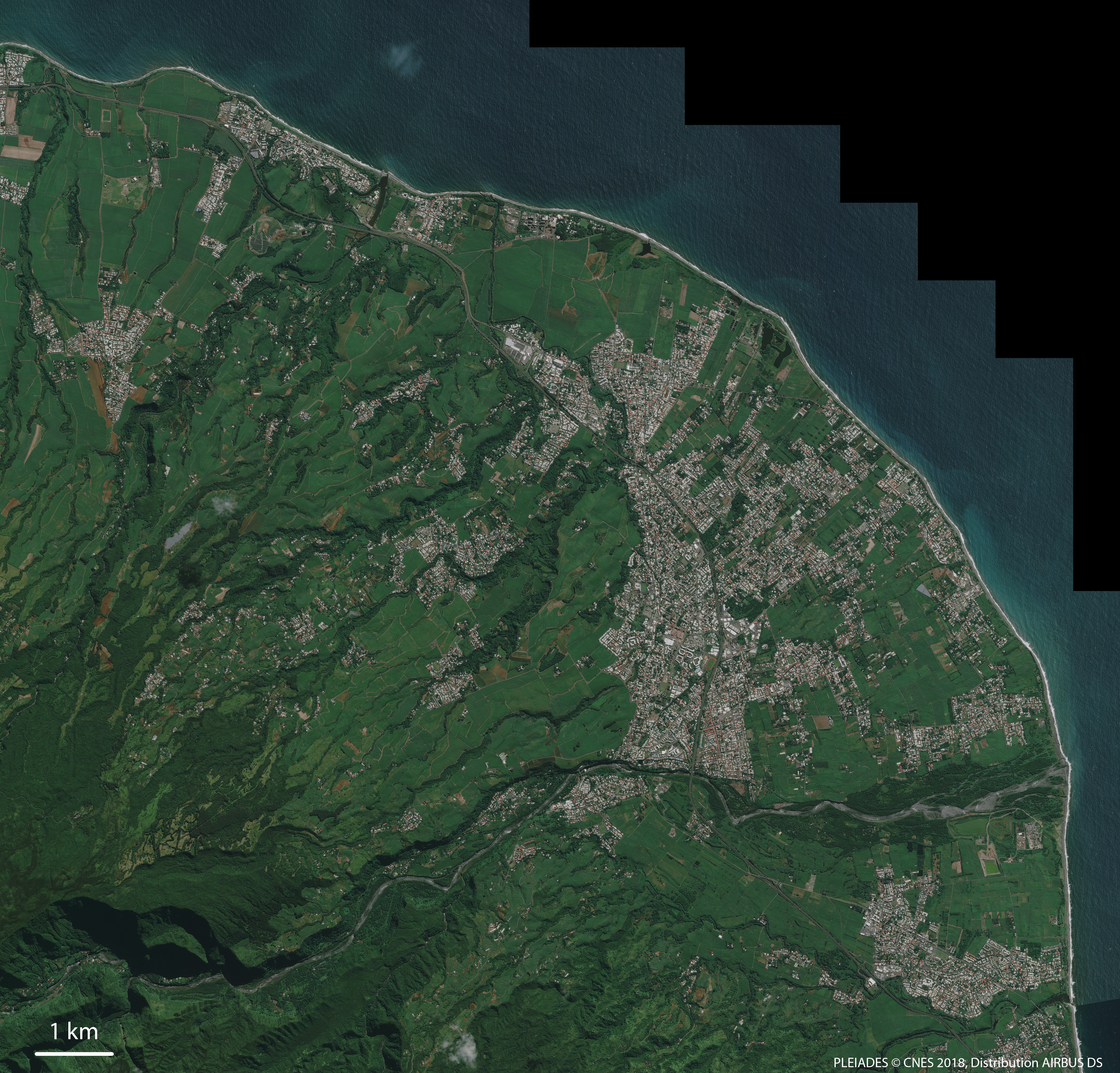 Ce cliché a été pris par le satellite Pléiades en janvier 2018. La résolution de l’image est de 0.70 m par pixel, ramenée après ré-échantillonnage à 0.50 m. Le cliché est en couleurs naturelles et recouvre un territoire de 12.5 km sur 6.75 km de côté. Le Nord géographique est dans le prolongement de la diagonale qui part du coin inférieur droit de l’image pour aller vers le coin supérieur gauche.