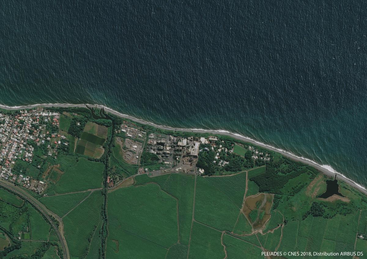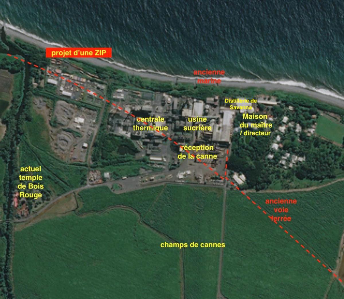 L’usine sucrière de Bois Rouge est installée sur le site originel, fondé en 1817 par la famille Bellier-Montrose.Quelques aspects de l’économie de plantation et du domaine (« l’habitation ») demeurent perceptibles sur l’image satellite. L’usine, adossée à l’océan, fait face aux champs de cannes qui recouvraient l’essentiel de la riche plaine alluviale littorale. La maison d’Adrien Bellier, avec son bassin, continue à surveiller l’ensemble. 300 esclaves puis, après l’abolition de 1848, autant d’engagés (jusque dans l’entre deux guerres) étaient employés dans les champs ou à l’usine. Les paillotes ou les longères (« calbanons ») qui logeaient cette main d’œuvre et leurs familles ont disparu sous l’emplacement de l’actuelle centrale thermique.