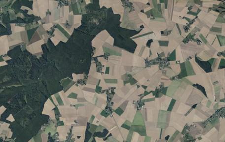Ces espaces agricoles sont largement influencées par les caractéristiques des territoires agricoles voisins. L’image laisse bien apparaître une continuité entre les grandes cultures du Vexin normand au sud, pays d’openfield dont on voit bien la marqueterie qui se prolonge et vient s’insérer entre les parcelles forestières. A l’échelle des parcelles agricoles, les lignes régulières indiquent le passage d’engins pour le labour, signe d’une agriculture mécanisée. Celle-ci est spécialisée dans quelques cultures : blé, colza, maïs et lin.