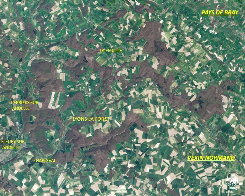 L’une des premières caractéristiques de cette forêt est d’être un ensemble morcelé, particulièrement échancrée. La forêt de Lyons n’a, de ce point de vue, rien à voir avec les grandes forêts constituées d’un seul bloc qui se trouvent dans sa proximité (forêt de Bord-Louviers, forêt de Brotonne, autres forêts domaniales), ou plus éloignées (massifs de Compiègne ou Fontainebleau). Elle produit l’effet d’un puzzle auquel manquerait de nombreuses pièces. Délimitée au nord-ouest par la vallée de l’Andelle, que l’on devine à gauche de l’image, en arc de cercle, la forêt domaniale connaît un prolongement avec d’autres étendues boisées, forêts privées cette fois-ci, sur le versant et le plateau opposés.