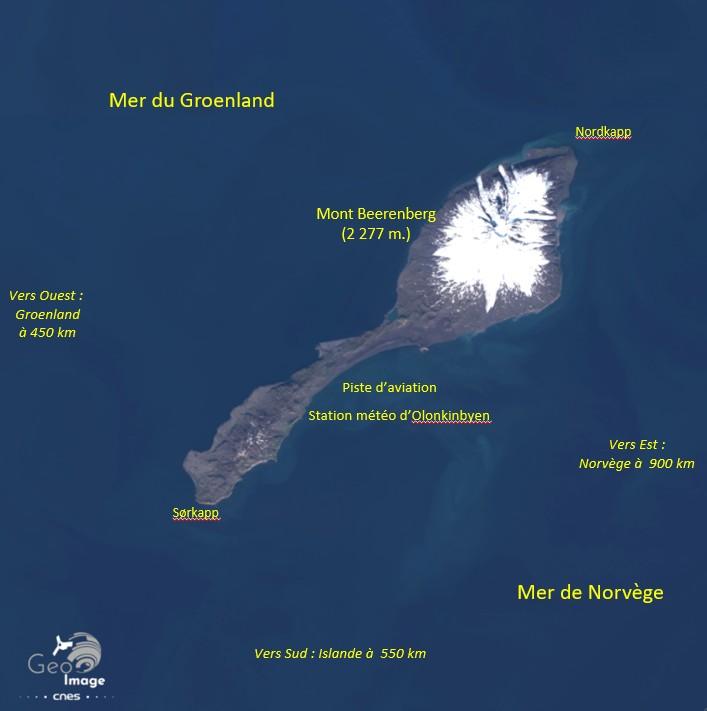 En plein océan Nord-Atlantique aux limites entre les mers de Norvège et du Groenland, l’image nous présente l’île Jan Mayen. Sous souveraineté norvégienne, elle se trouve cependant très loin de la Norvège : les terres les plus proches, les îles Lofotens, sont à plus de 900 km vers l’est. Rattaché administrativement au comté norvégien du Nordland, ce territoire insulaire est donc très excentré.
