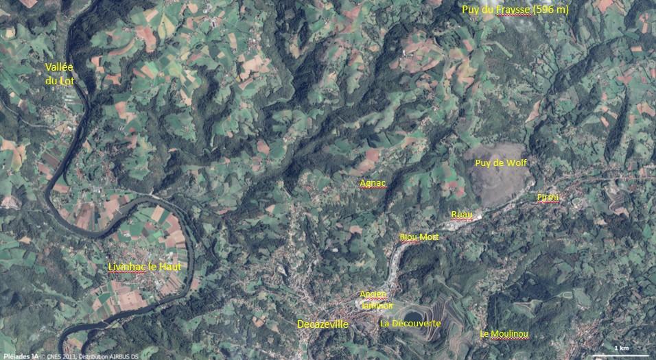 L’activité minière, comme dans les autres pays noirs, a transformé le paysage. La « Découverte » en est le symbole et le marqueur le plus visible. Cette mine à ciel ouvert et le lac qui s’est créé au fond depuis 2001 se distinguent aisément sur le cliché. « La Découverte de Lassale » est restée en activité très tardivement car elle demeurait rentable du fait des moyens mécaniques utilisés par la centaine de mineurs qui y travaillaient en 2001. De plus, sa production alimentait une centrale électrique située sur la rive gauche du Lot, à la limite inférieure de la photographie, assurant un débouché à la production.
