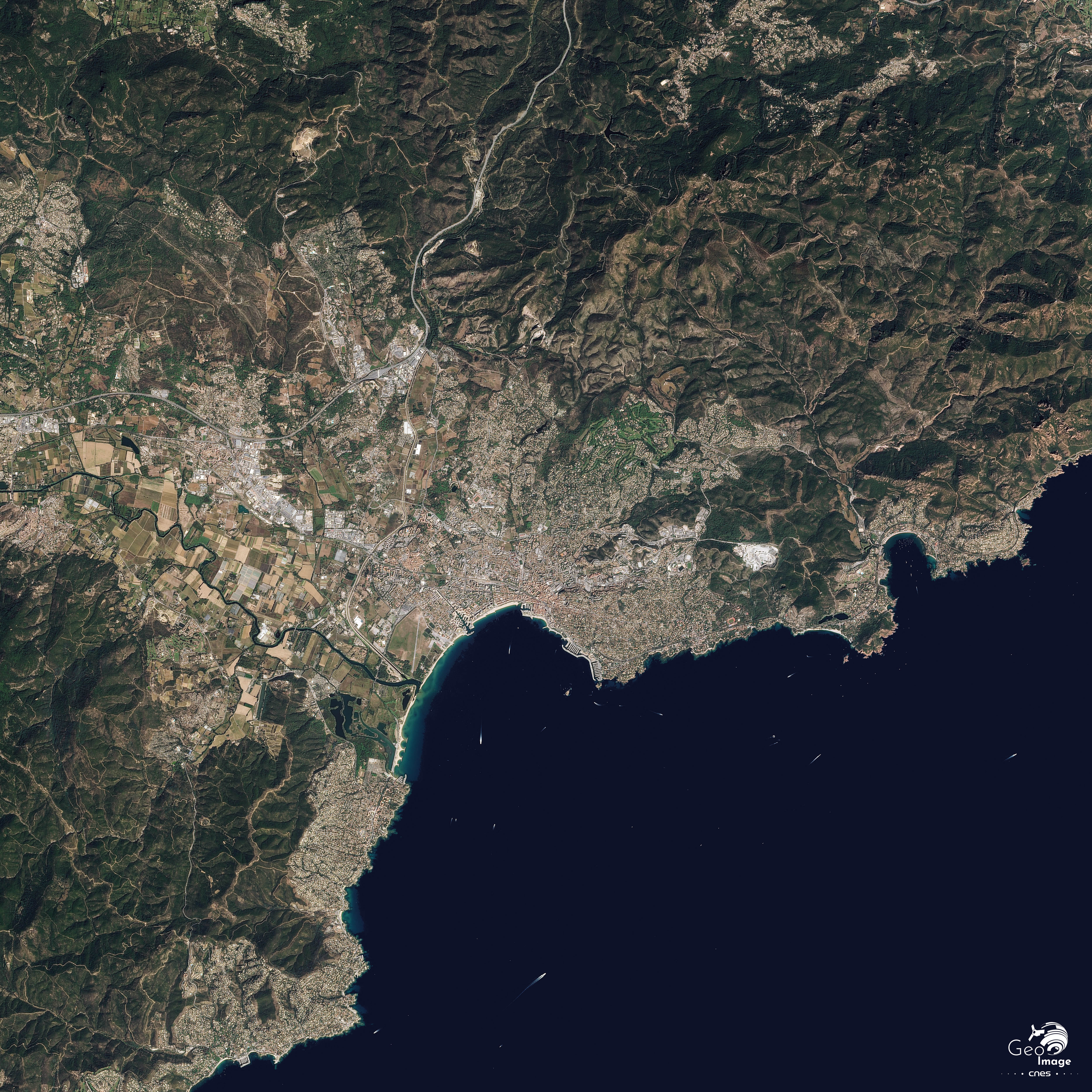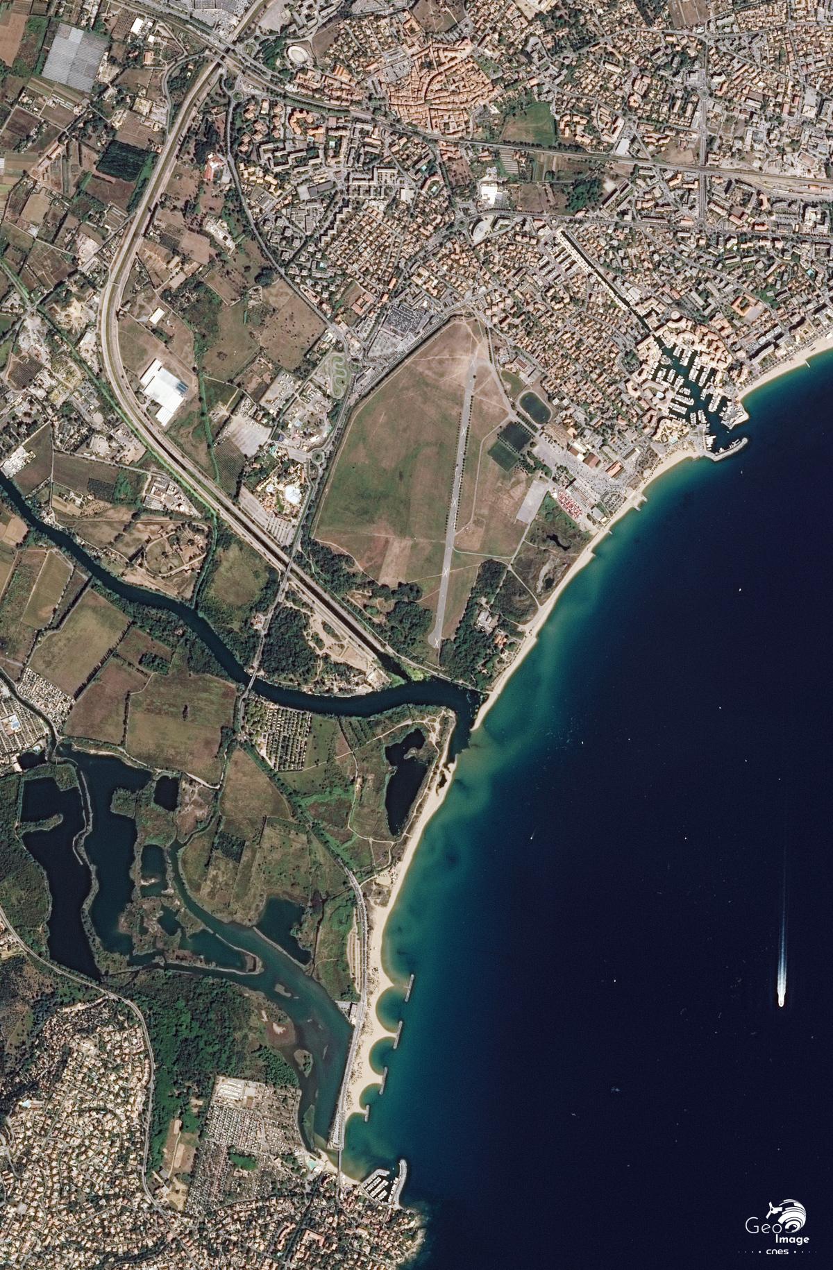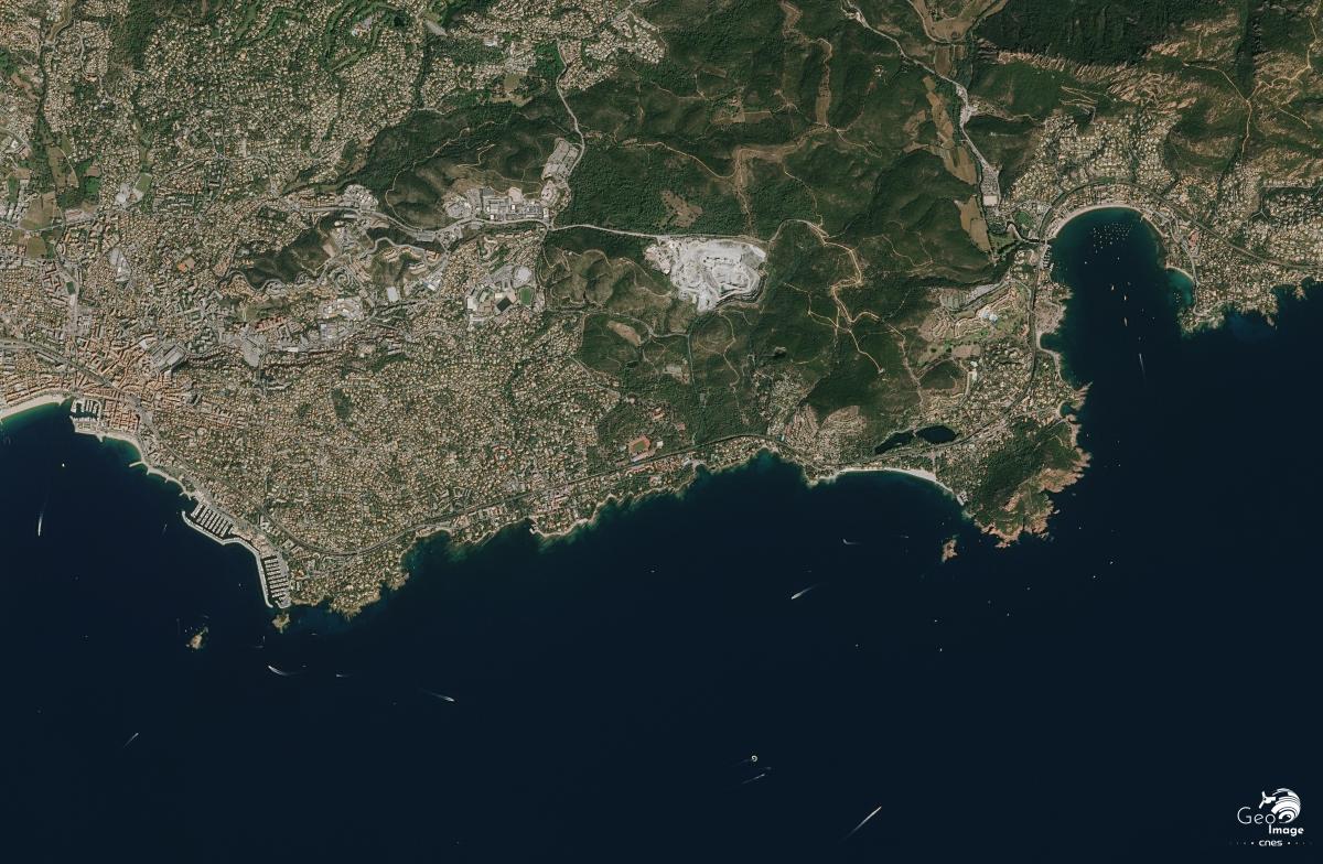 Cette image de la région de Fréjus / Saint-Raphaël a été réalisée par le satellite SPOT 6 en 2018. Il s’agit d’une image en couleurs naturelles de résolution à 1,5 m.