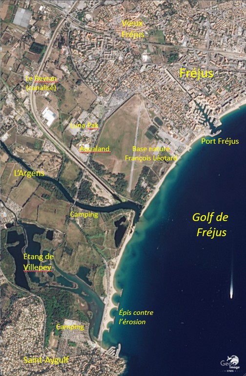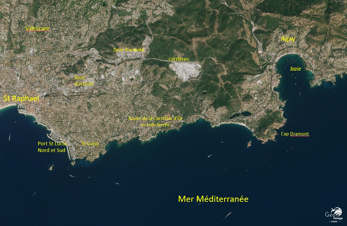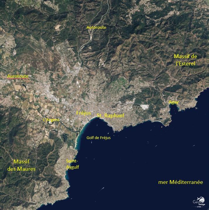 Ainsi, le tourisme et l’urbanisation de l’agglomération de Fréjus-Saint-Raphaël posent la question de la gestion environnementale par leurs conséquences néfastes (érosion marine, artificialisation, déséquilibres sur la biodiversité) et les risques accrus. L’image satellite permet de bien souligner ces enjeux.