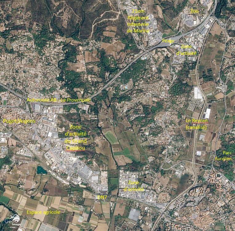 L’observation d’une vaste zone industrielle et commerciale à l’ouest de la photographie dévoile un troisième aspect de la périurbanisation. Il s’agit de la ZI du Grand Capitou. Elle est située au nord de la commune de Fréjus, en bordure du massif de l’Estérel. Ce parc industriel a été initié en 1963, réhabilité en 2003 (Pôle Capitou Sud) et étendu au nord en 2014 de l’autre côté de l’A8 (Pôle Capitou Nord). Il atteint aujourd’hui les 34 hectares et a une vocation économique essentiellement centrée sur les services, le commerce et le BTP. Le secteur du Capitou recense également des campings et le zoo de Fréjus.