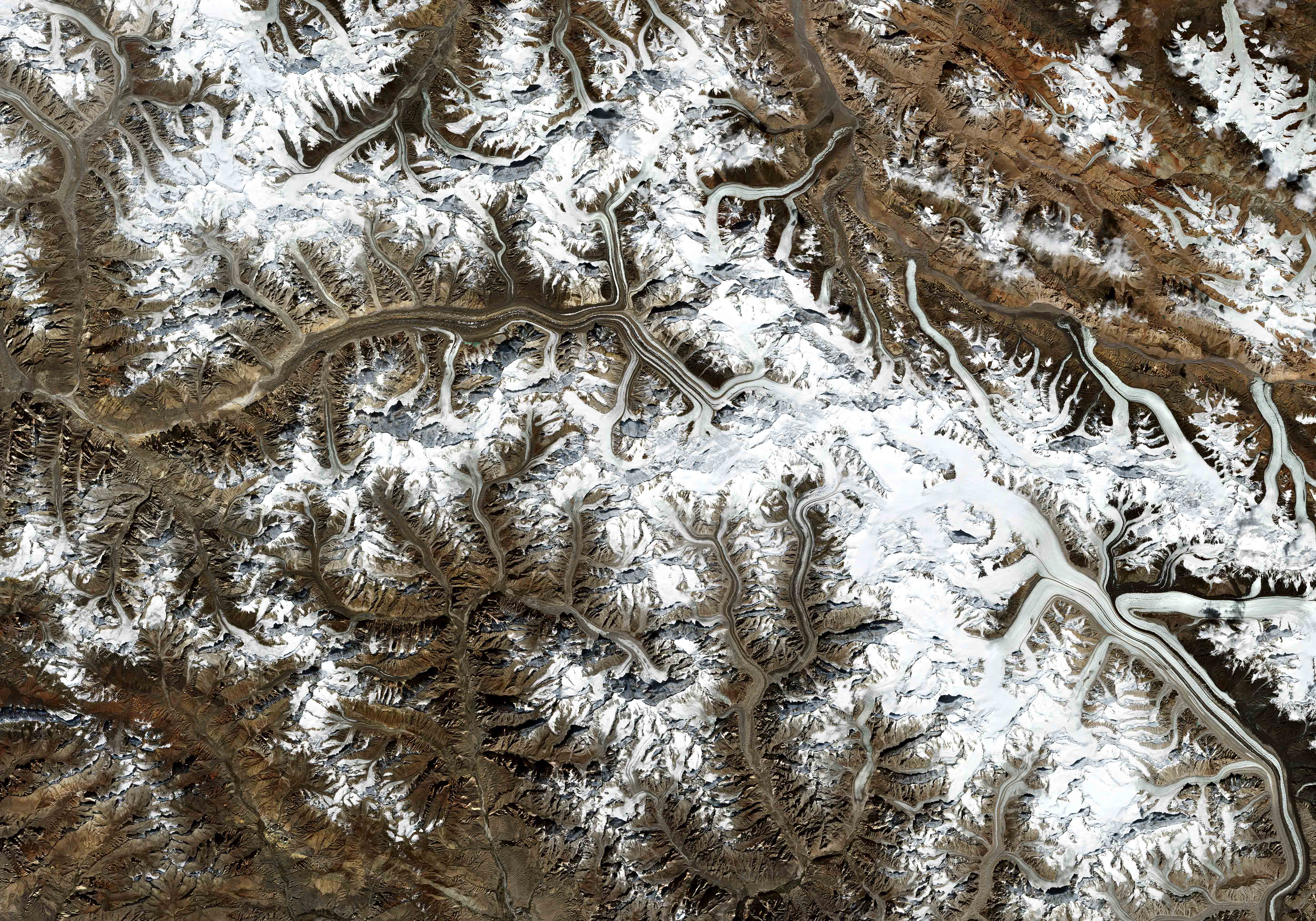 Prise au mois de septembre et couvrant la partie orientale de la chaîne du Karakoram, cette image est exceptionnelle du fait de sa clarté, de sa transparence et de sa luminosité. Car elle présente un massif très souvent couvert, au moins partiellement, par des nuages. Elle permet donc une approche et une étude détaillées d’un espace pour l’essentiel très largement inaccessible.